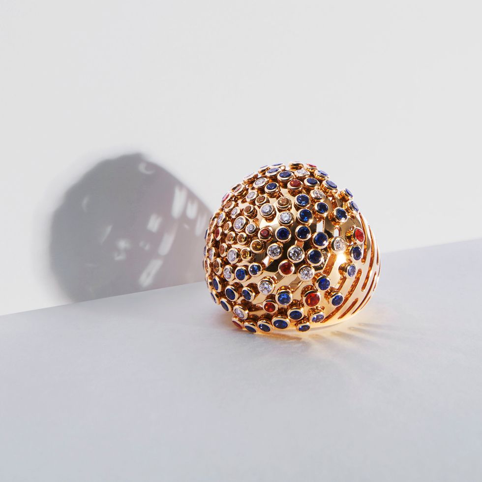 The Les Galaxies de Cartier ring is one of the stunners from the collection. Made of 18-karat yellow gold, 24 brilliant-cut diamonds totaling 0.64 carats, 70 yellow and blue sapphires, 12 fire opals, there are only a limited edition of 30 numbered pieces worldwide. The ring, like its matching bracelet and pendant, is designed so that a flow of moving stones are mounted upon a rail which radiates continuously.