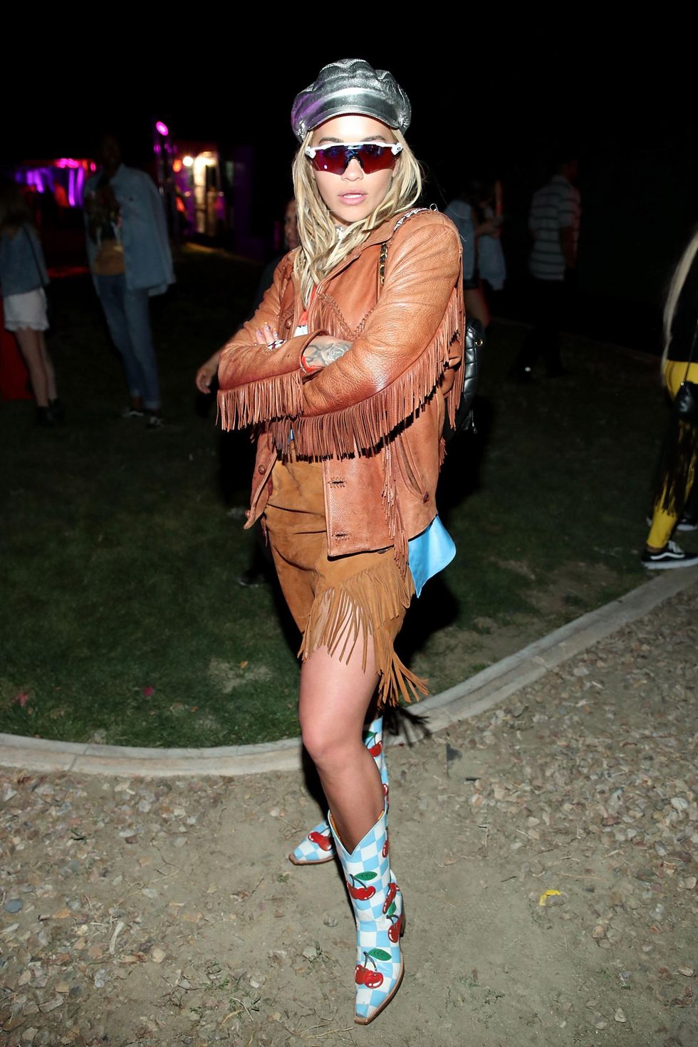 Look: Ora here is giving us "Do you even Coachella?" and it's a lot. There is of course, the obligatory suede and a lot of tassels (props to anyone that did not don a tassel, lace or a scrap of crochet this weekend). I'm not loving the mixture of eras (60s cap, 70s jacket and skirt, naughties sunglasses) but I am certainly here for those boots. Unfortunately, there is just too much happening right here and it's an all-round no, dawg. Lose just one item, Rita, just one. She did, however, redeem herself with this look, accessorized with a sweaty Jeremy Scott. Bless