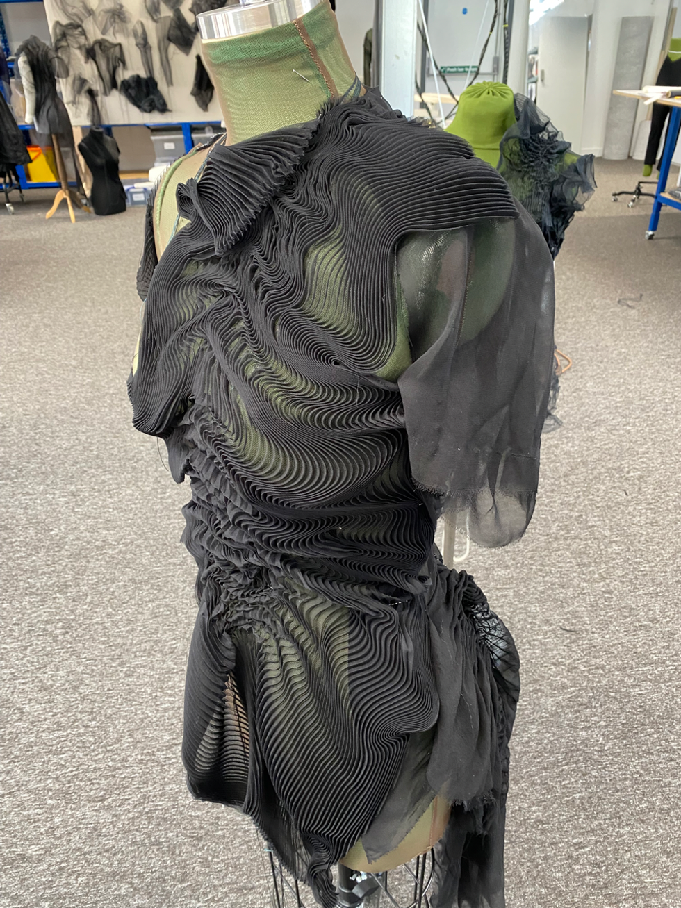 Elphaba goes from the little girl's dress into that beautiful black coat, and then the dress that's underneath, which is hand felted and has details inspired from mushrooms, tying her or her to nature as a point of reference. And then she goes into a Shiz uniform, which has the same kind of structure and rigidity that her original clothes have. As she finds acceptance within the community of Shiz and for herself, she starts to open up. She starts to loosen. And as she's developing her magic and really taking hold of that, she's going into silhouettes that are more trousers with kilts, and they allow for more agility. It's a modern silhouette that feels more powerful than some of the silhouettes that are based in the turn of the century. It’s a huge creative license, but it has that point of reference because of the dress from the 1939 film of The Wizard of Oz. Everyone is entering into the theater to experience Wicked with some point of reference of what this world is.