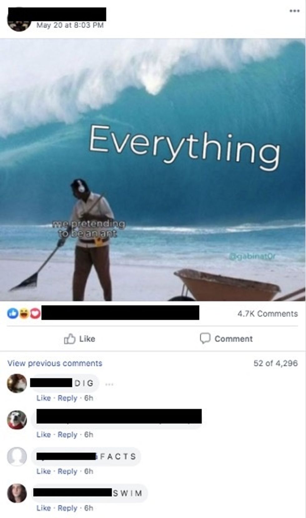 A month ago this strange community had around 145,000 members. At publishing time, it had 1.8 million. "We went from having maybe 100 posts a day, to 85,000 pending posts in the span of a few hours," says Tyrese Childs, 20, the founder of the group. He says the group's members are as young as 13, though most are between 18 and 24. "It provides a space where you are only interested in one thing: being an ant. And that's why the pandemic will increase Facebook's relevance. People just want to escape to another world," he says. Indeed, character is rarely broken on the site, and current crises are almost never alluded to. "Just want to say thank you to the creator of this page you've helped me get thru a lot of depression with this group during this hard time," one earnest poster did break character to share with the group.