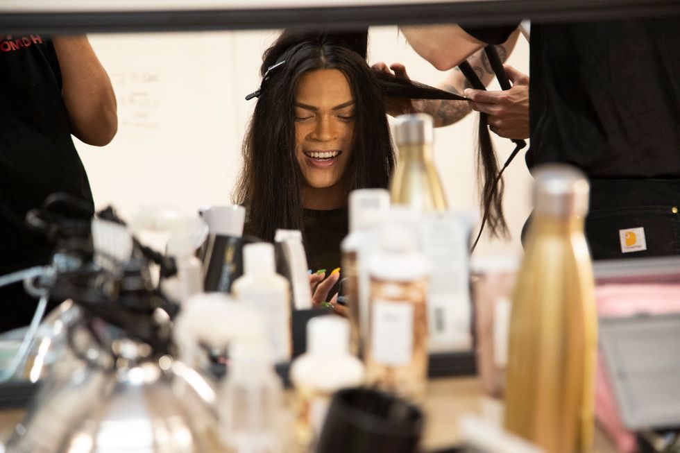 But there, lifting me up was drag performer Charlene Incarnate, who kissed me on the lips when I told her she was beautiful. There, lifting me up was Blew Velvet, a friend and fellow musician and artist, who shared the bathroom with me when I urgently had to pee. Also lifting me up was Philip, who, in a platinum blonde Anna Wintour bob, told me about her nerves about gracing her very first runway. And still, she assured me, "Trust, it's gonna be a moment, love. And that's that on THAT, love." Or the makeup artist who rubbed lotion on my brown skin to keep it hydrated and dewy. Or the makeup artist from the Poconos who applied a bold red lip to my mouth with loving, articulate exactness when I told her I wanted my lips to be juicy and shiny enough for everyone to want to kiss me.
