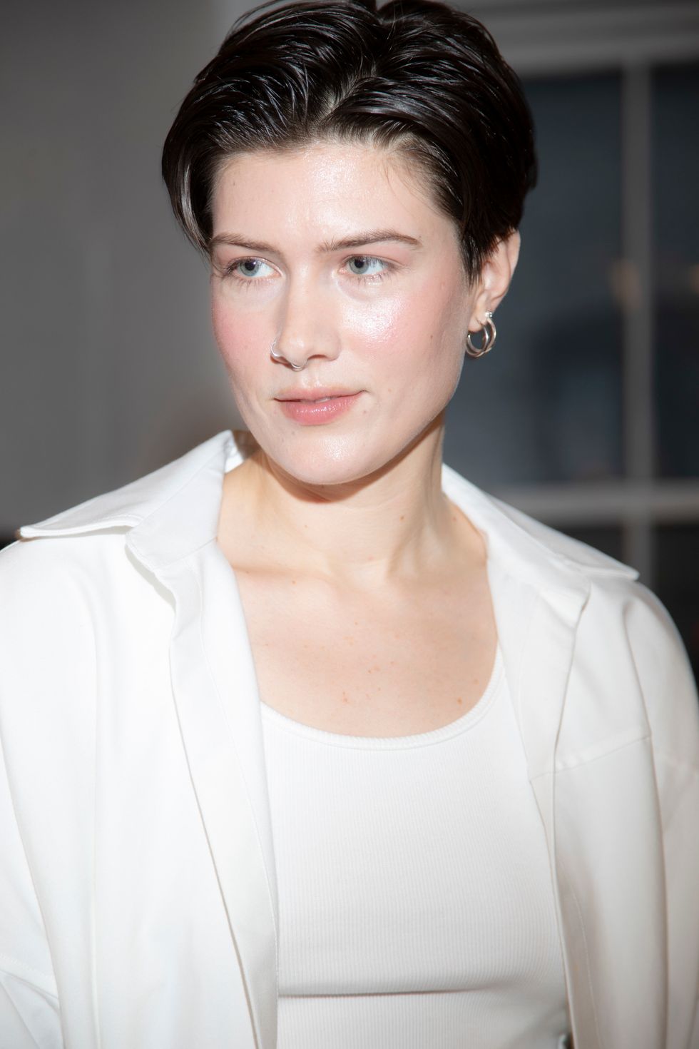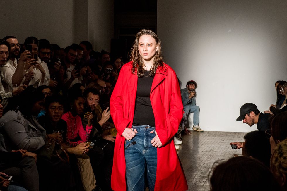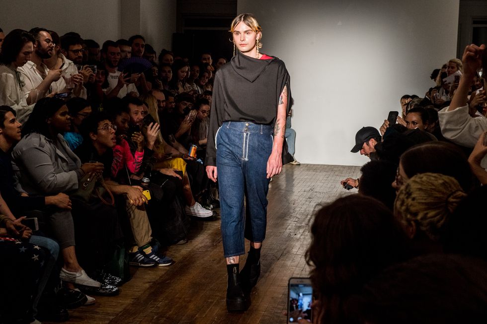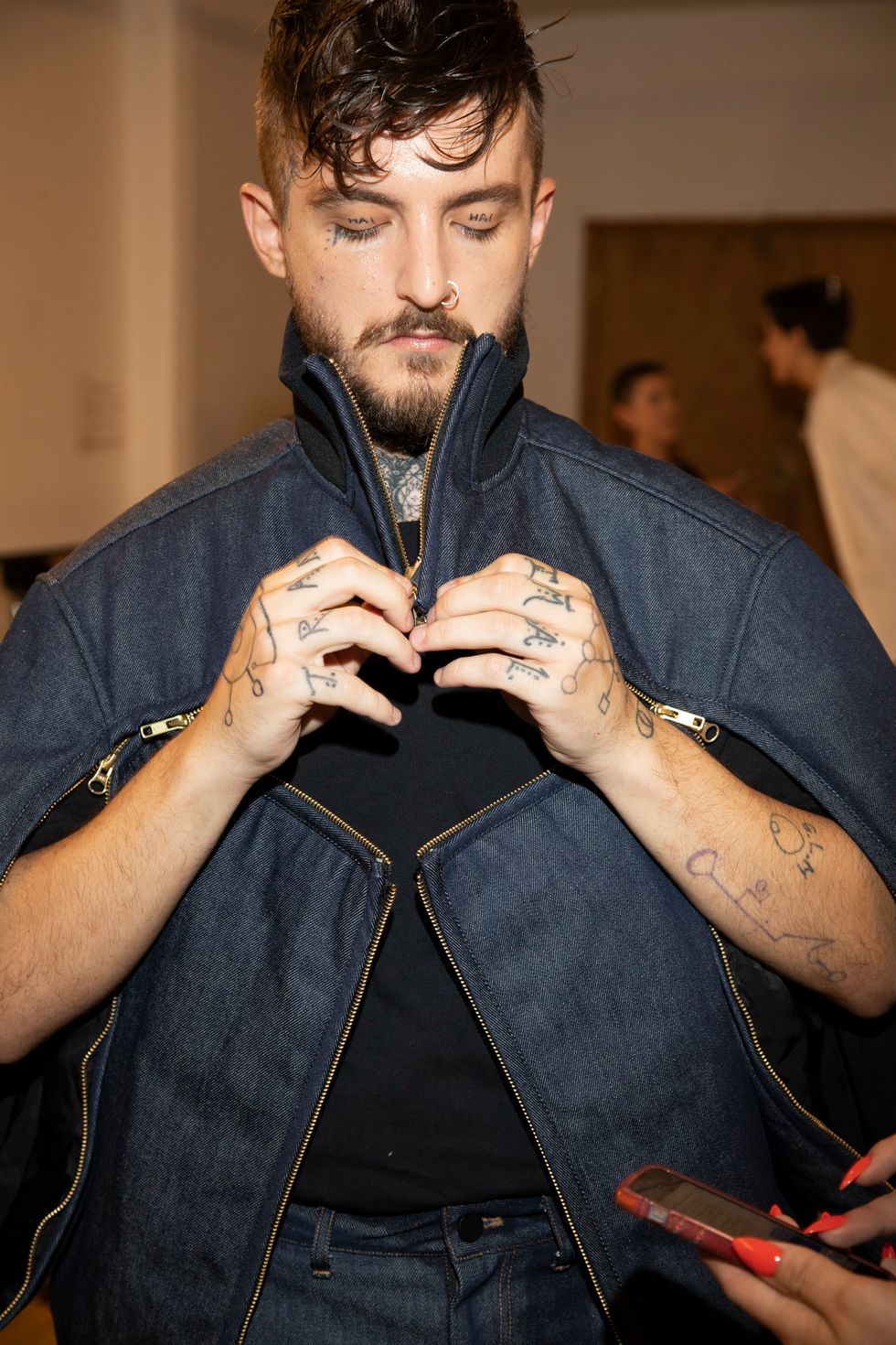 Norris put all the models in customized Blundstone boots, varying in platform size. To keep things idiosyncratic, as if done by random selection, the tallest models sometimes had the tallest shoes, or the shortest. Norris kept the color scheme restricted to bold neutrals like red, black, and denim, and added detailed twists to classic staples. What might be thought of as men's dress shirts, like the black one I wore, were tailored like oversized, sexy blouses, with long tails in the back and sleeves meant to dangle off the shoulder for extra skin exposure.