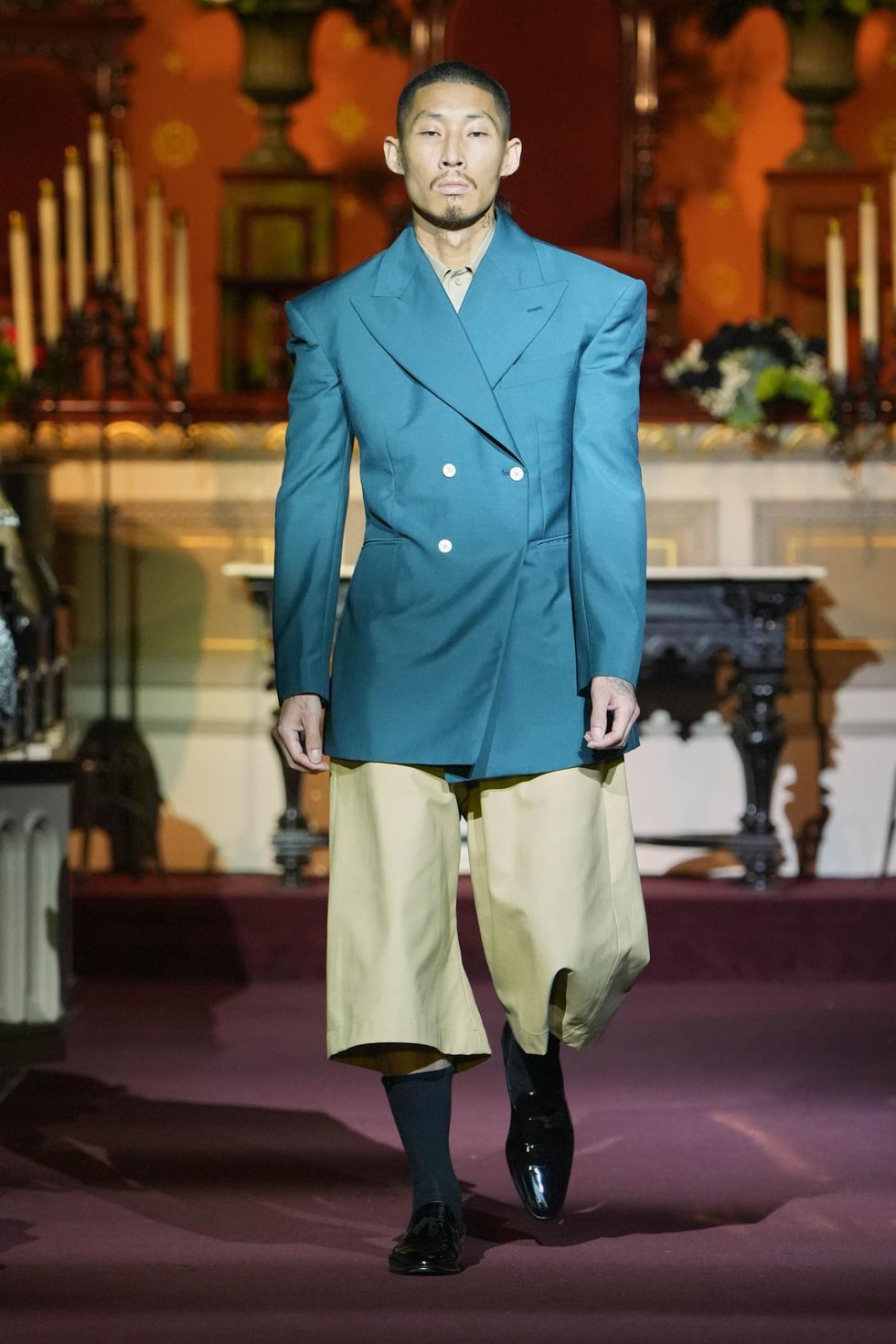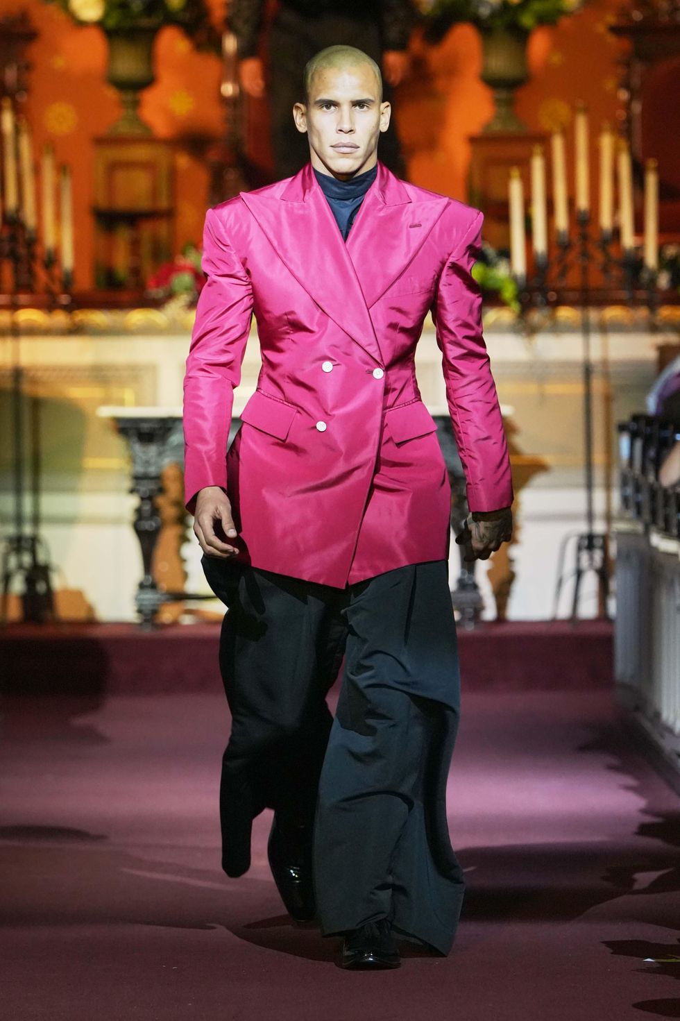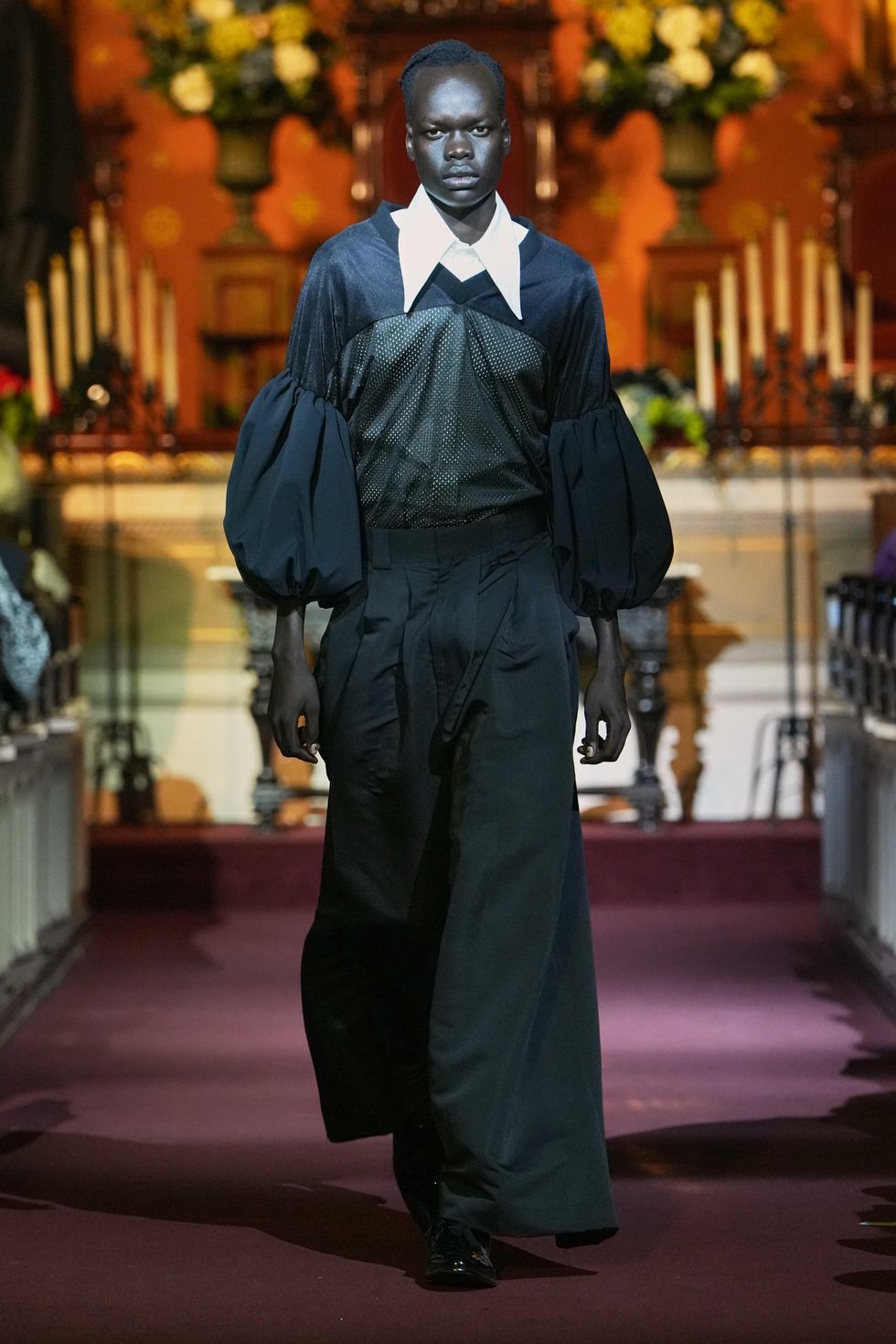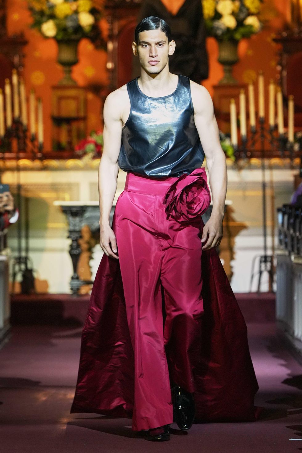 For his Spring 2023 collection, titled “Please Rise,” 55-year-old Chavarria continued to showcase the possibilities around men’s evening wear. Suiting had dramatically extended lapels and cinched waists; bright colors like cyan or magenta were introduced in satin, with massive roses pinned to waists and collars; jersey tops had puffed up sleeves like members of clergy. As always, his tailoring was impeccable and the silhouettes were XL.