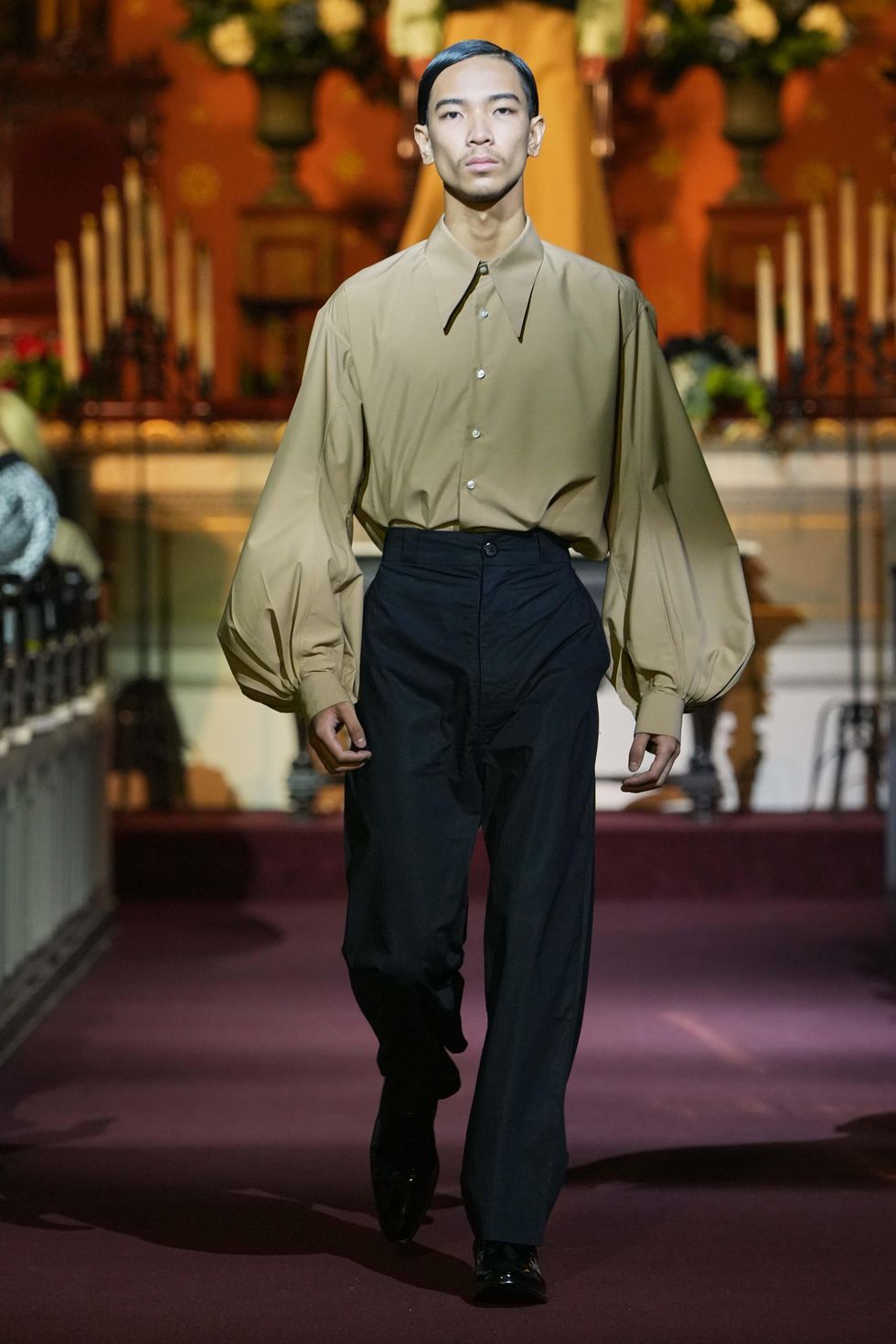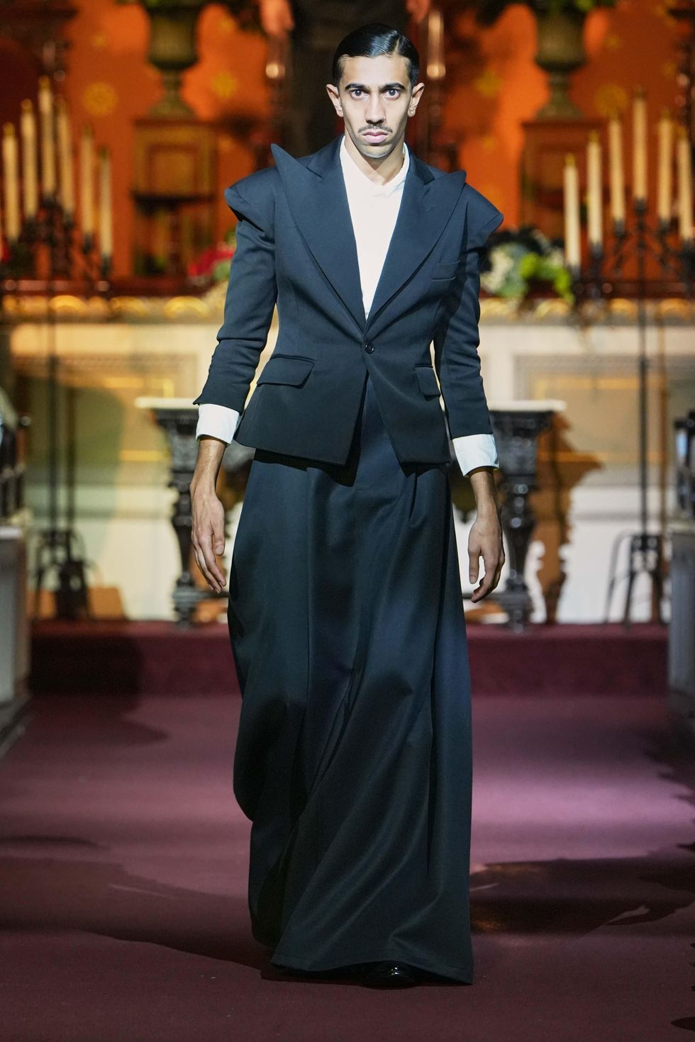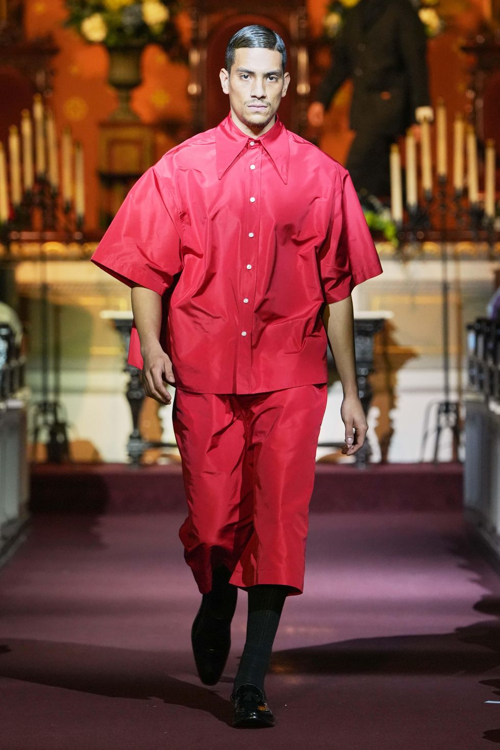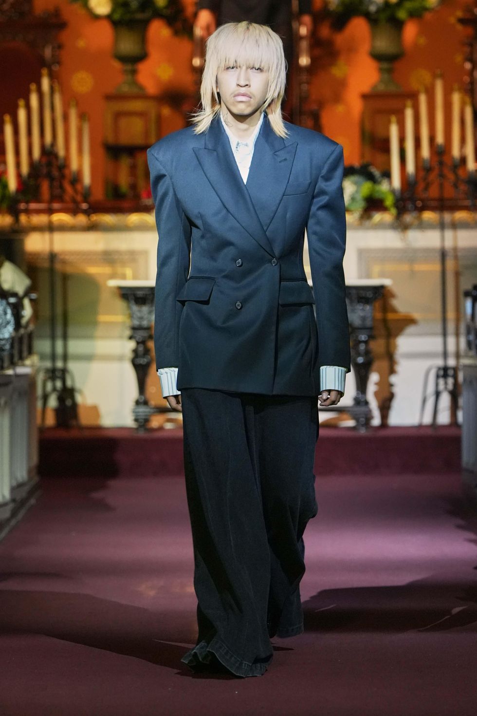 For his Spring 2023 collection, titled “Please Rise,” 55-year-old Chavarria continued to showcase the possibilities around men’s evening wear. Suiting had dramatically extended lapels and cinched waists; bright colors like cyan or magenta were introduced in satin, with massive roses pinned to waists and collars; jersey tops had puffed up sleeves like members of clergy. As always, his tailoring was impeccable and the silhouettes were XL.