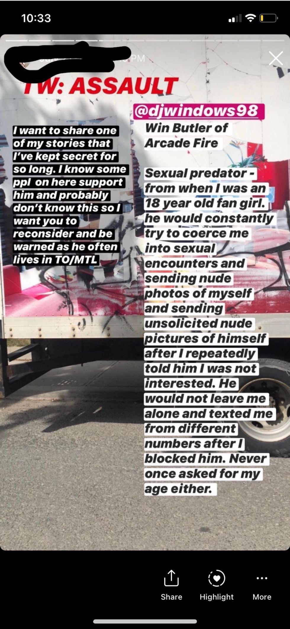After a sexual encounter with Butler in her bedroom before Arcade Fire's show in Vancouver in 2017, Fiona became increasingly distressed by having to keep everything a secret as well as the transactional nature of their relationship. She attempted suicide afterward. Both Fiona's friends and family noticed behavioral changes in her around the time of their relationship. Butler claims that Fiona reached out to start sexting again, but none of the screenshots he provided to Pitchfork corroborate.