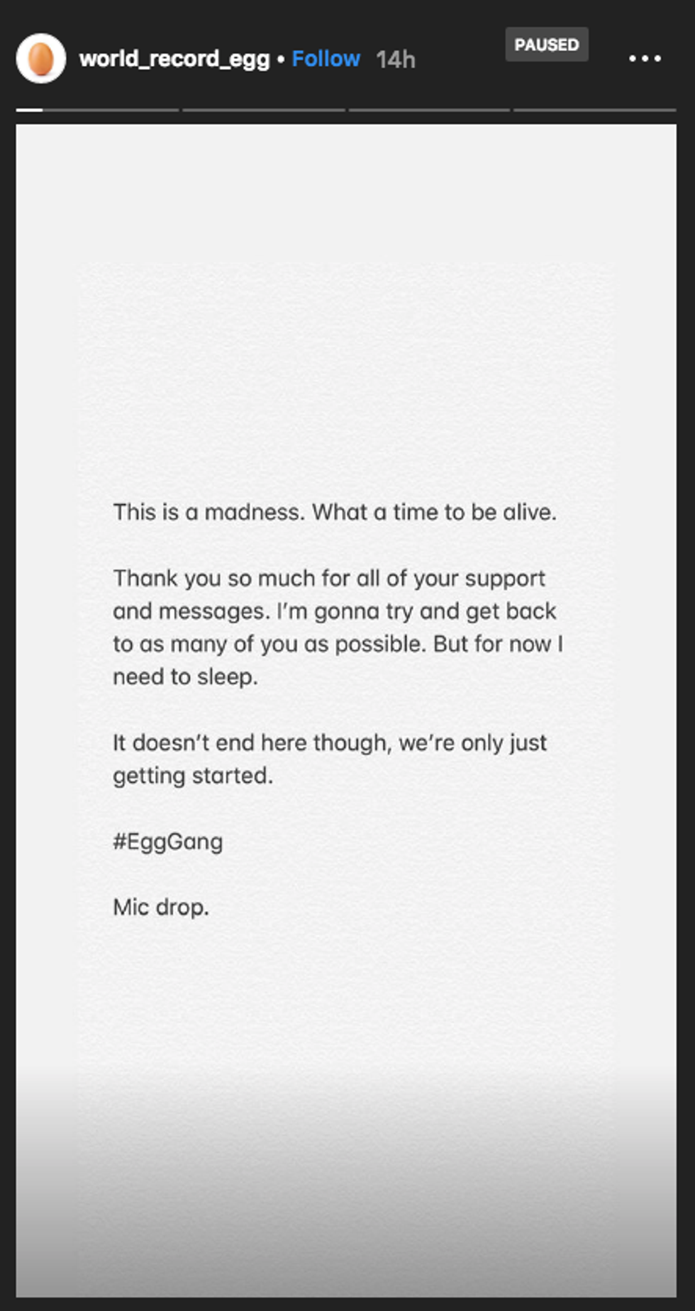 Following its victory, the egg account, which refers to its new following as "Egg Gang" made a celebratory post on its story. It's also promised a forthcoming merch drop, and shared a warning about imposter egg accounts, and an egg-dubbed spoof of "Can't Touch This."