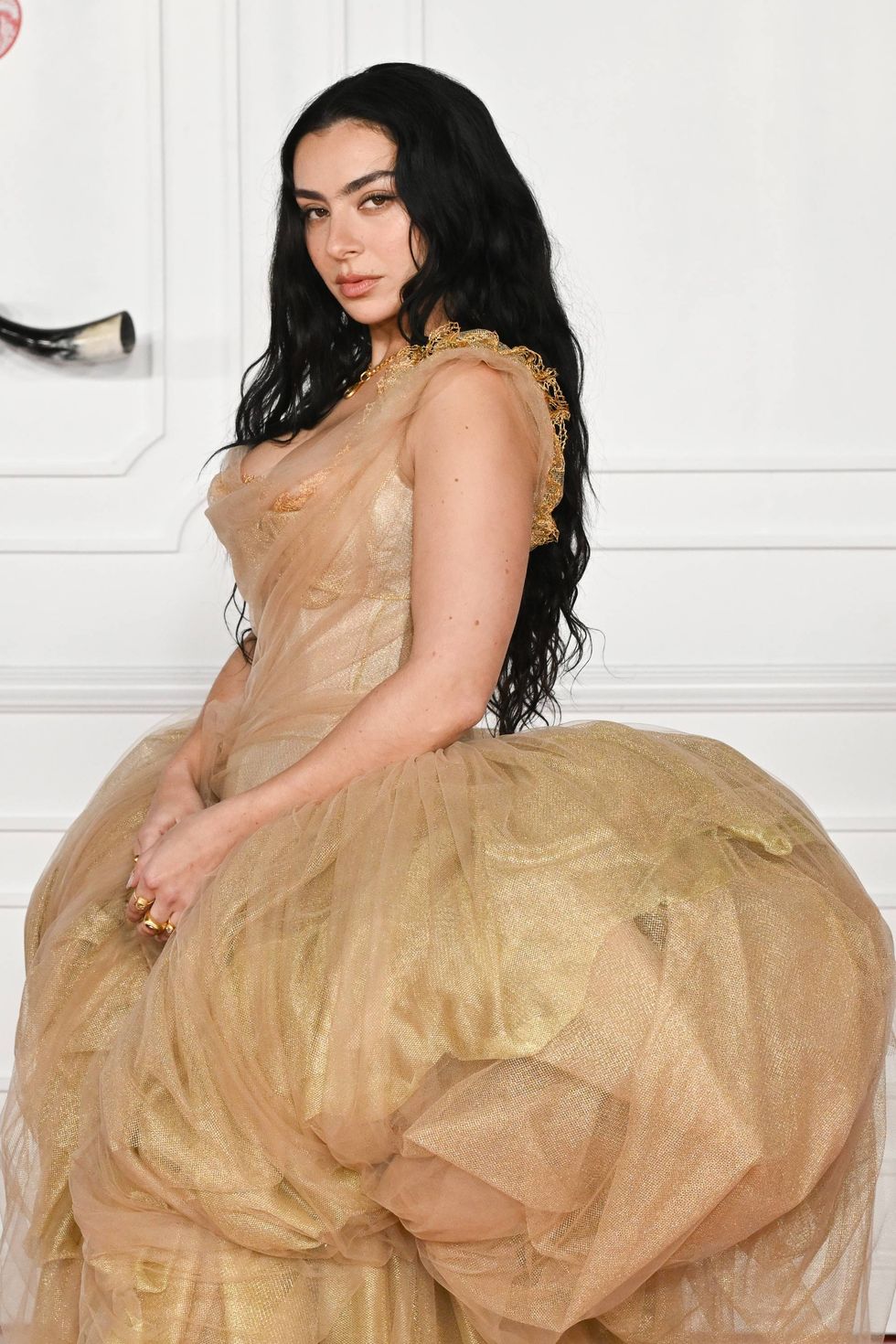 If Elizabeth Taylor was the Queen of Hollywood, Charli xcx is the Mistress of Pop. Here she in in custom Vivienne Westwood, looking exactly like you'd expect a cool British party girl to look in custom Vivienne Westwood. The hair is dramatic, the glam is signature, the dress is a moment. (The moment, if you will.)