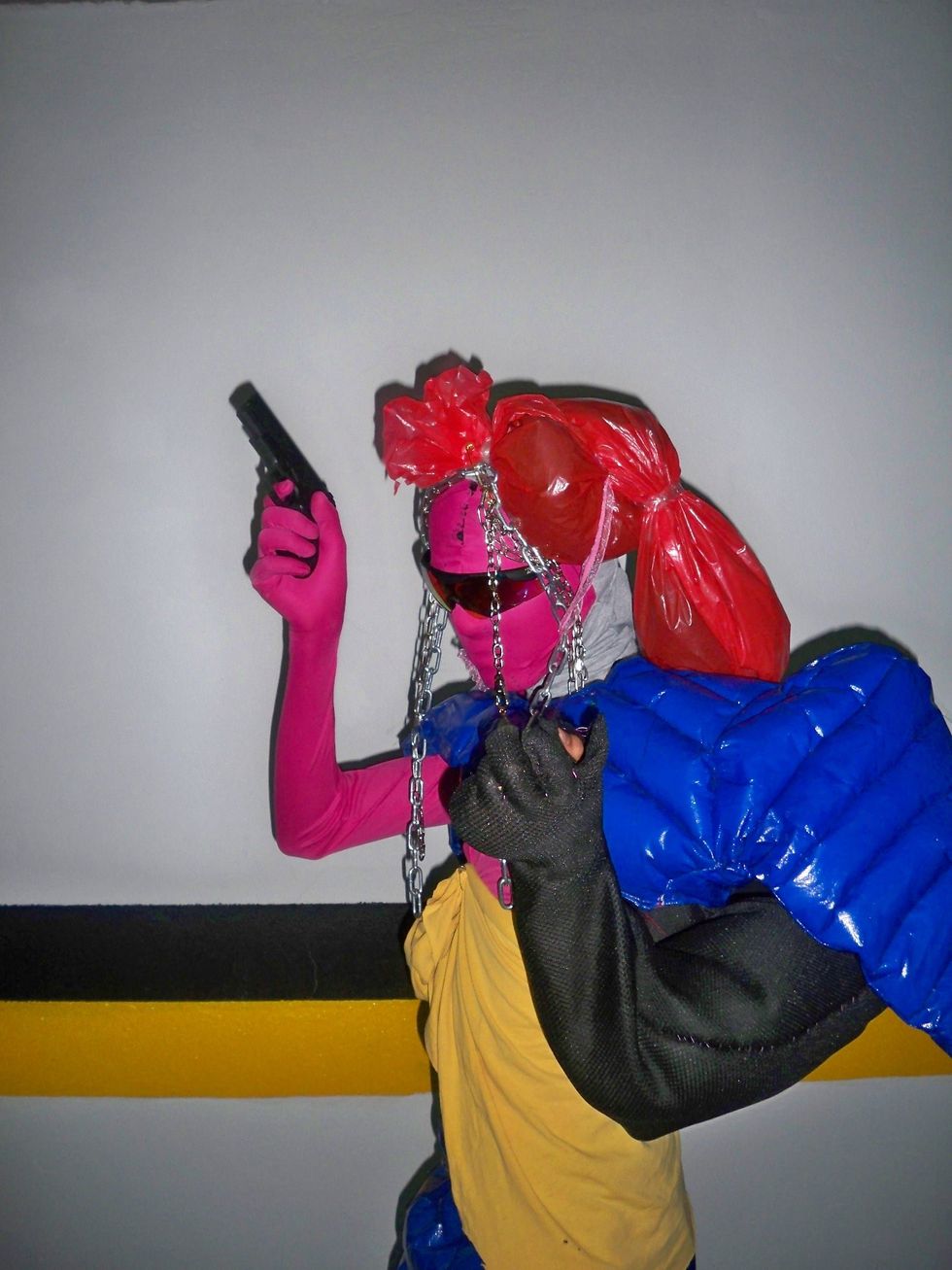 The visual itself feels like a couture drag performance unearthed from dark-web creepypasta, with Yajaira waving a glock around a dimly lit parking garage like a high-camp Slenderman. Adorned in a wig made of chains and plastic bags, a pink morph suit, a puffer dress reminiscent of Pierpaolo Piccioli's Moncler work and a pair of large mutant high heels, Yajaira's outlandish look and magnetic presence rides the line between subversive and absurd. (The Babadook should be shaking in her boots.)