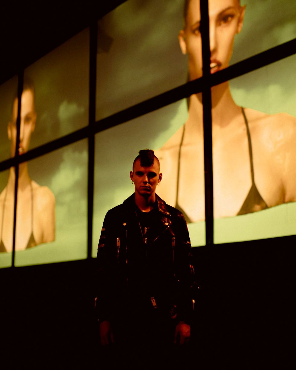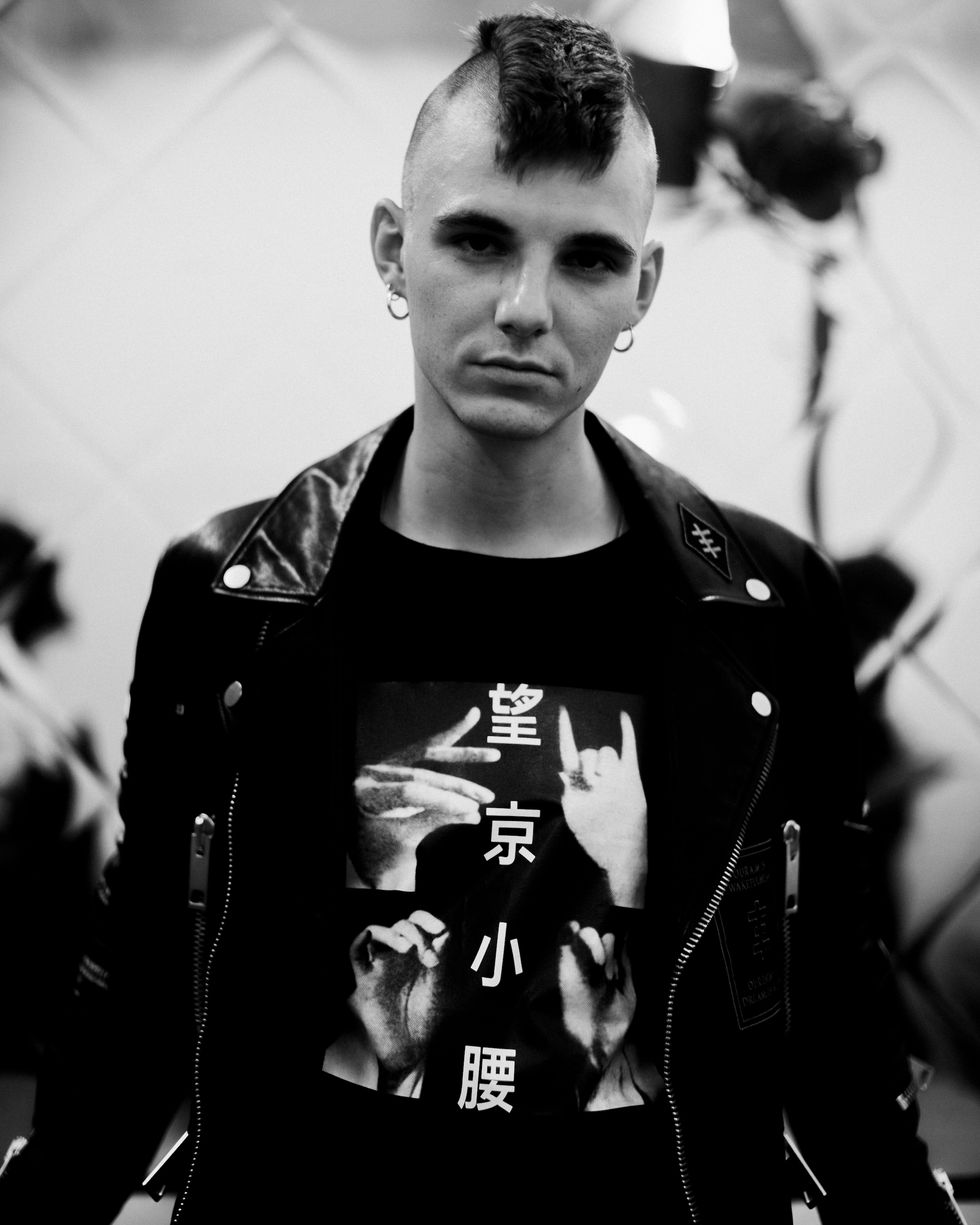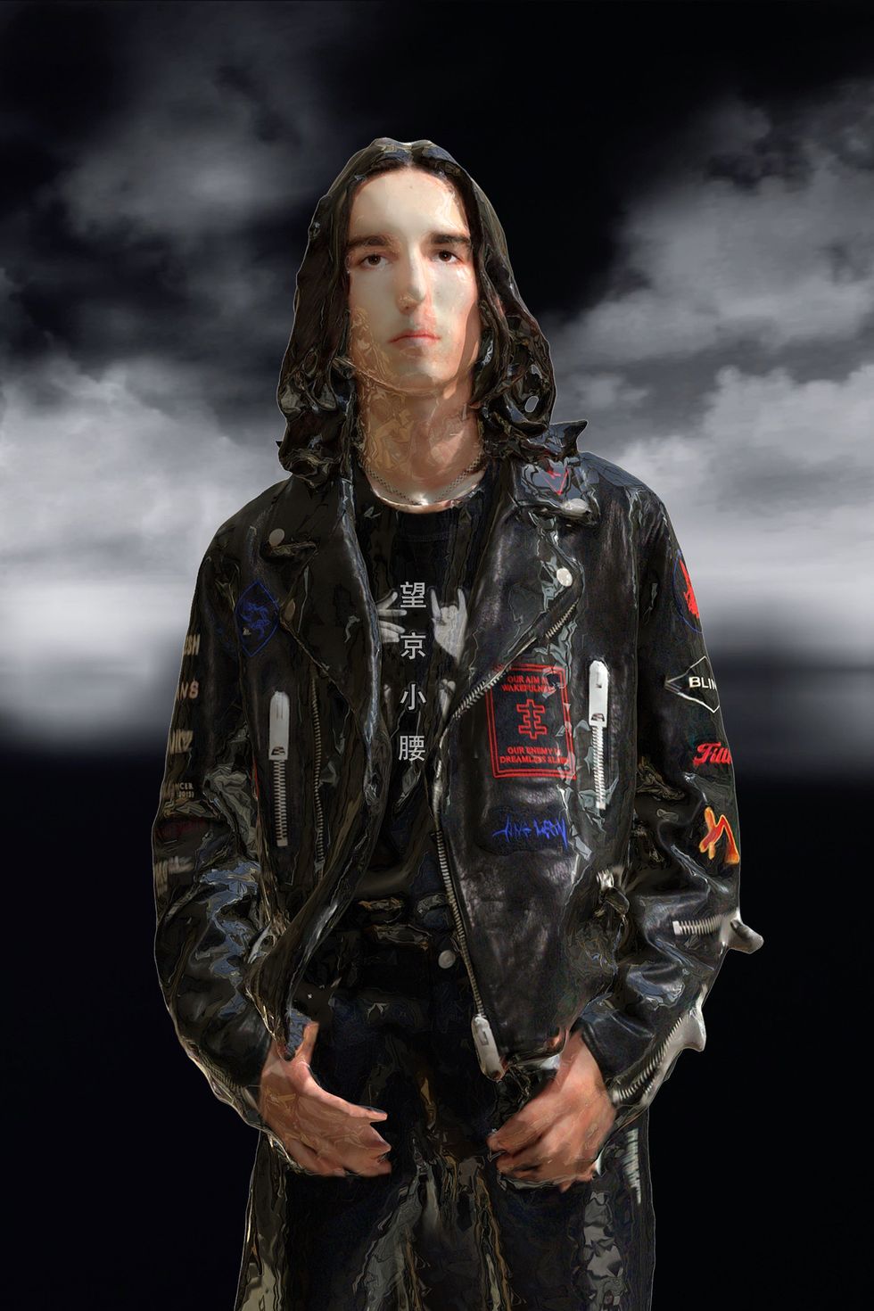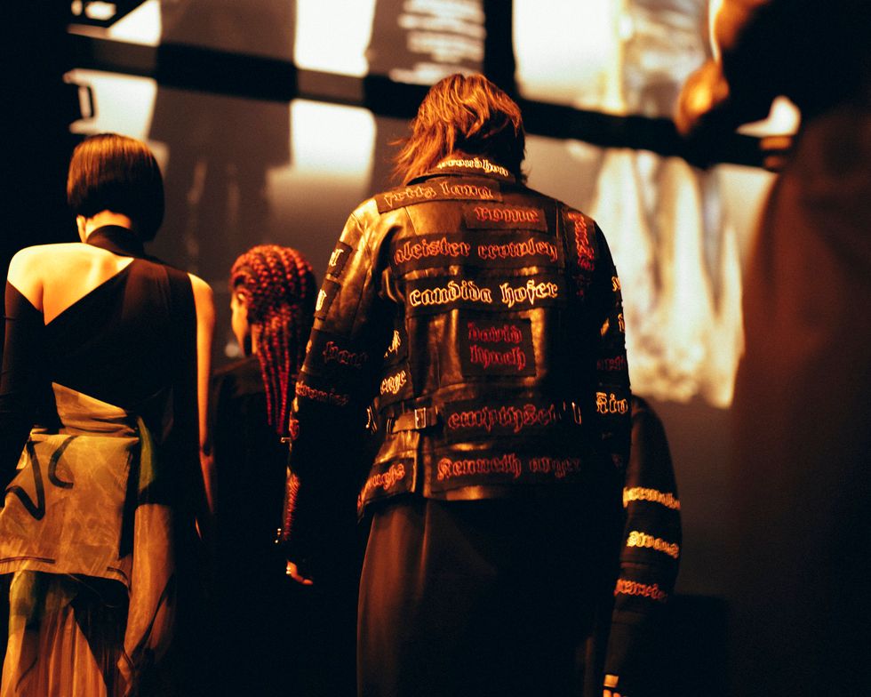 The clothes were infused with rock 'n' roll — the scanned models were even shown holding guitars. One of Aldridge's scans sported a t-shirt with "Just Like Honey" lyrics: "Listen to the girl/ As she takes on half the world." Leather jackets abounded, and there was a good deal of dramatic evening wear. But while the garments had a real '90s vibe, Li's presentation methods are decidedly modern.