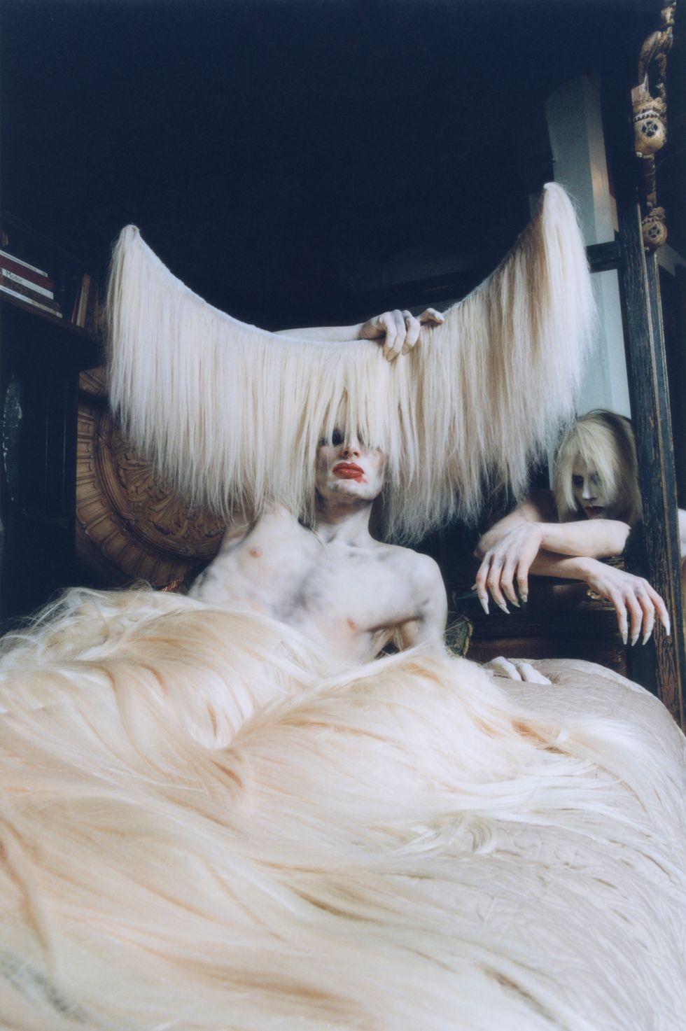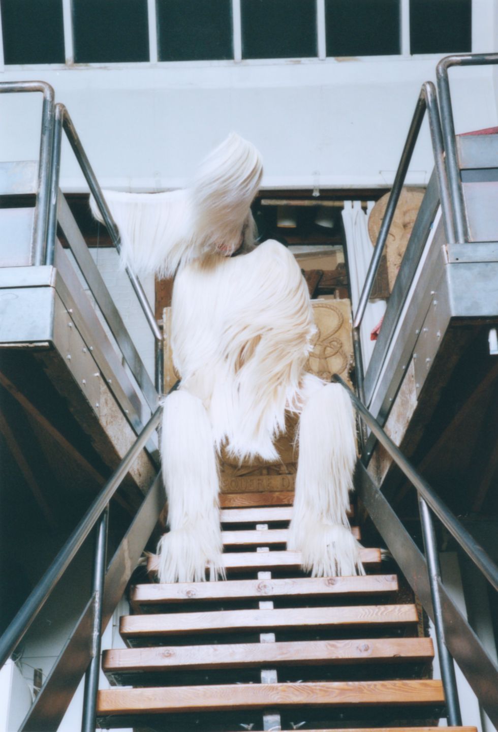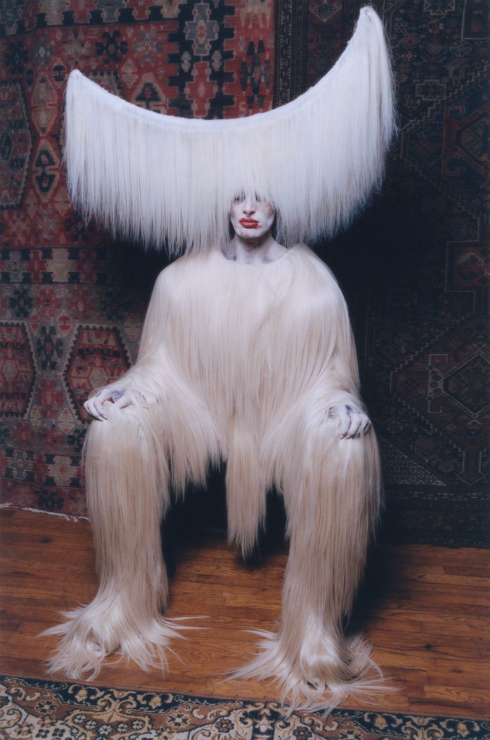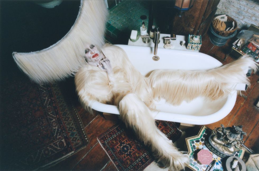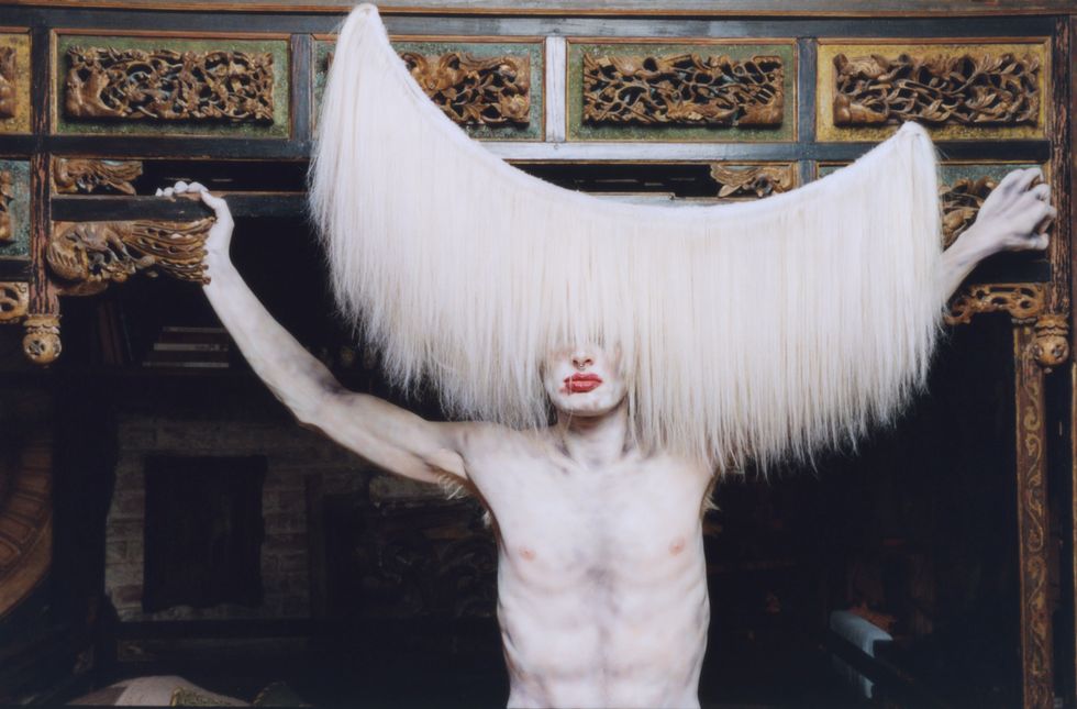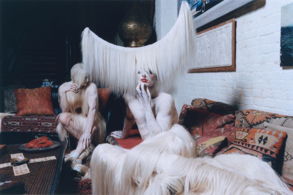 Zamboni's glam team, Nina Carelli and her assistant, started with airbrushing their entire body, followed by their face. The hardest part, Zamboni explains, was to get the hand-painted sclera contact lenses from Veiled Optics into their eyes. After four hours of makeup, they continued to install the hairy headpiece — a massive crescent draped in white human hair — made by past collaborator Charlie Le Mindu, who’s worked with the likes of Michèle Lamy, Naomi Campbell and Lady Gaga. Finally, after seven hours total spent in hair and makeup, Zamboni got dressed in head to toe human hair to match the headpiece and strapped on a pair of seven-inch platform heels. The heels, 19-inch headpiece and Zamboni's already tall stature resulted in an 8’3" beast.