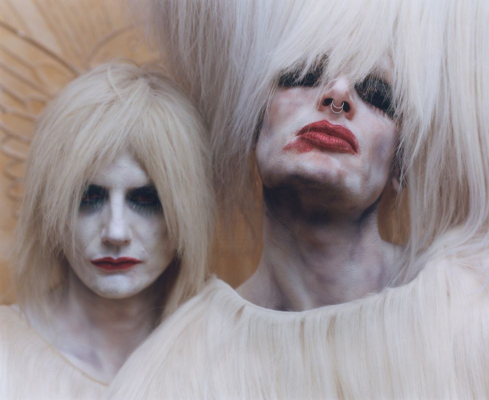 Sometimes, for better or worse, fashion is truly pain. At the party with bestie Aaron Kohler in a similar look, Zamboni basically couldn't see anything. The sclera lenses made their vision dark red and the hair from the head piece covered their eyes. Using stairs or the toilet? Impossible. But Zamboni says that the reaction from everyone — people on the street, the Uber driver, partygoers and Miss Klum herself — made the struggle worth it. "I felt so good in the look," Zamboni tells PAPER. "I completely forgot that I barely slept for days, and we enjoyed the party until early morning."
