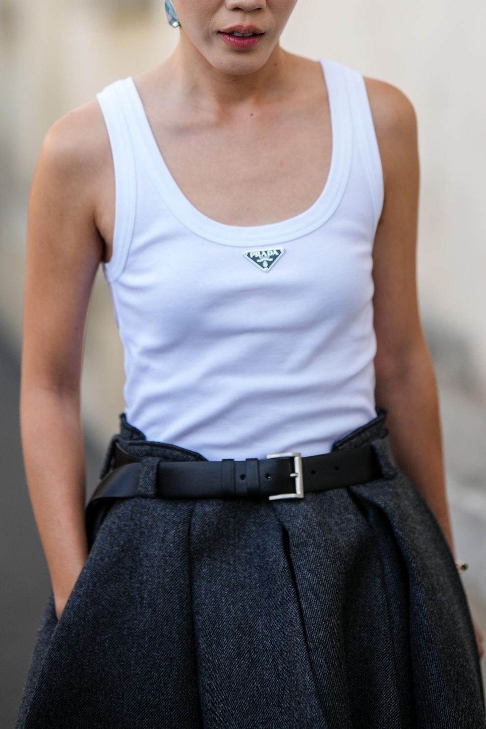 The humble tank top enjoyed a renaissance this year with numerous versions on the runway, most notably Prada's Fall 2022 show which made the plain ribbed garment the star of its collection, affixed with nothing but its signature triangle logo. The first look of Bottega Veneta's first show under Matthieu Blazy showed blue jeans and a white tank (though it was all made from leather). Julia Fox filmed some DIY tank top hacks on TikTok and Justin Bieber wore one under his Balenciaga suit at the Grammys. And designers like Kingsley are finding new ways to cut, slice and fit one to make it of-the-moment and utterly sexy.