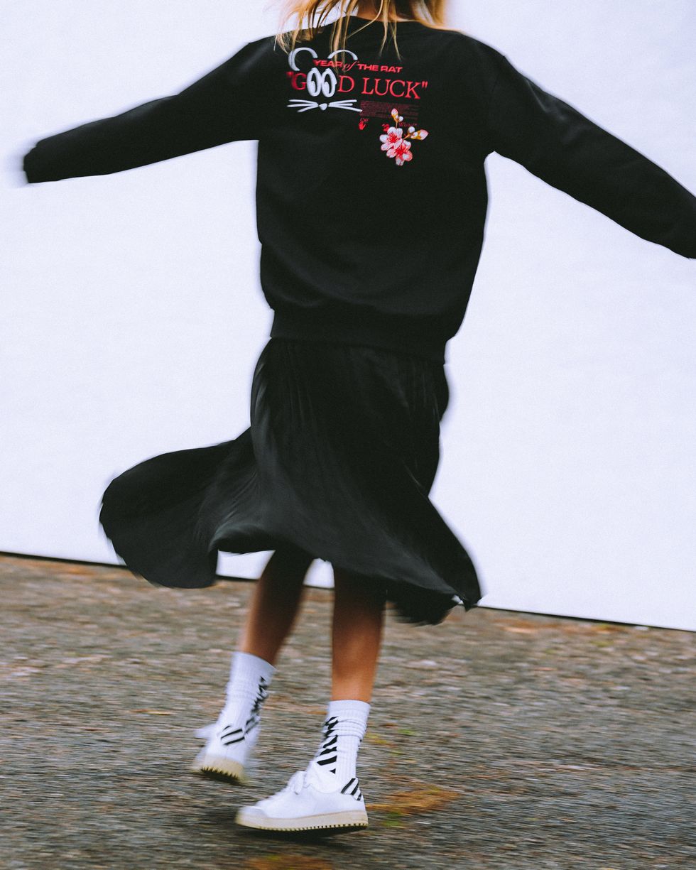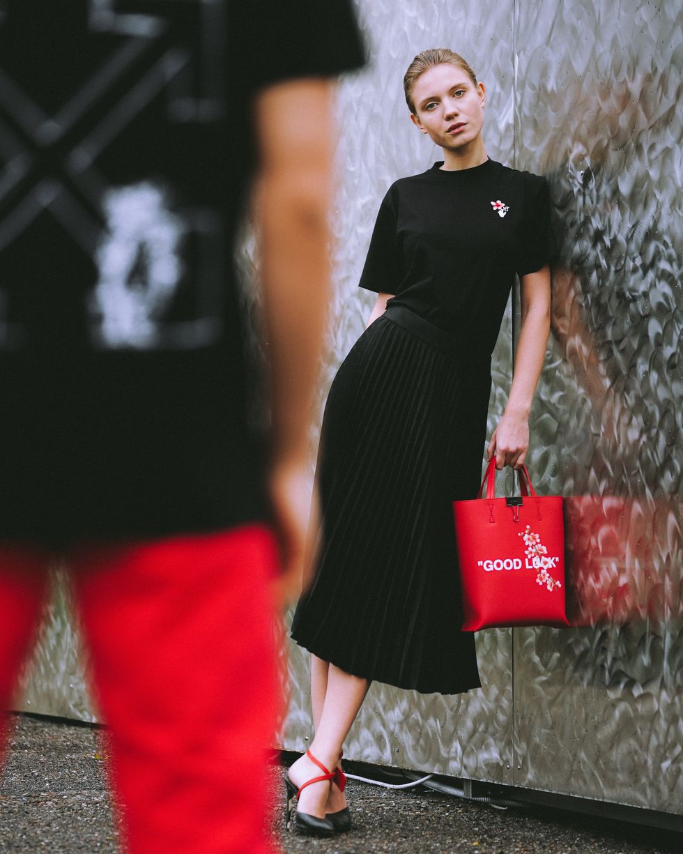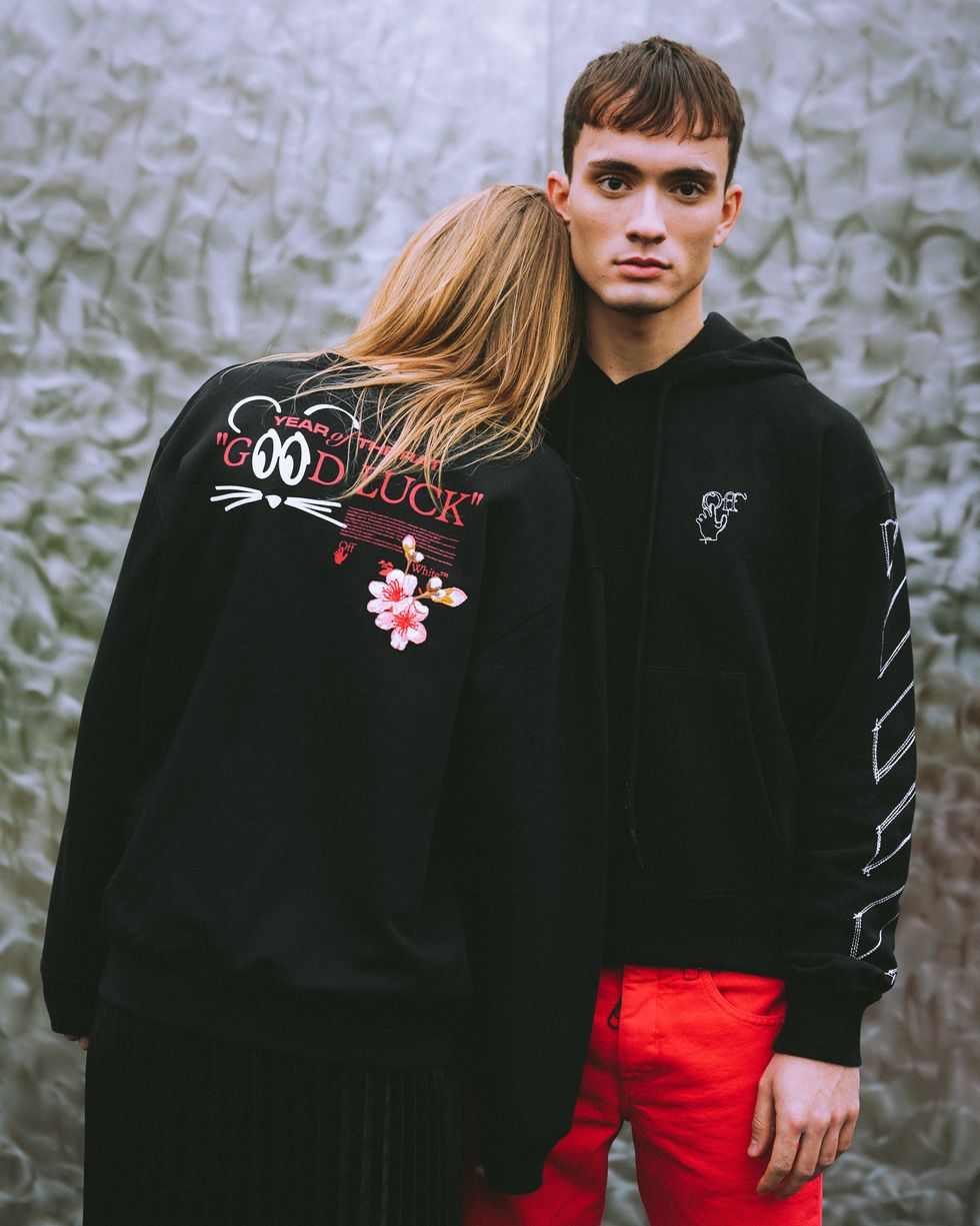 This year's zodiac symbol adorns everything from tees to long-sleeve sweatshirts. Standouts include a black "OFF" logo pleated skirt and red leather bags with "GOOD LUCK" written across. (Red is the most predominant color of the Chinese New Year, which represents fortune and joy.)