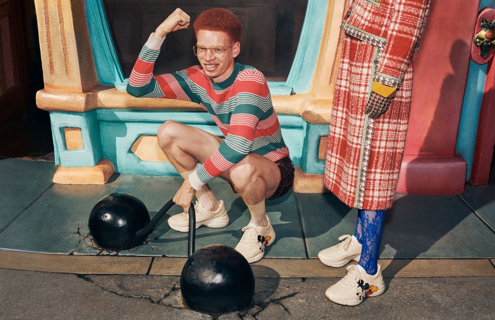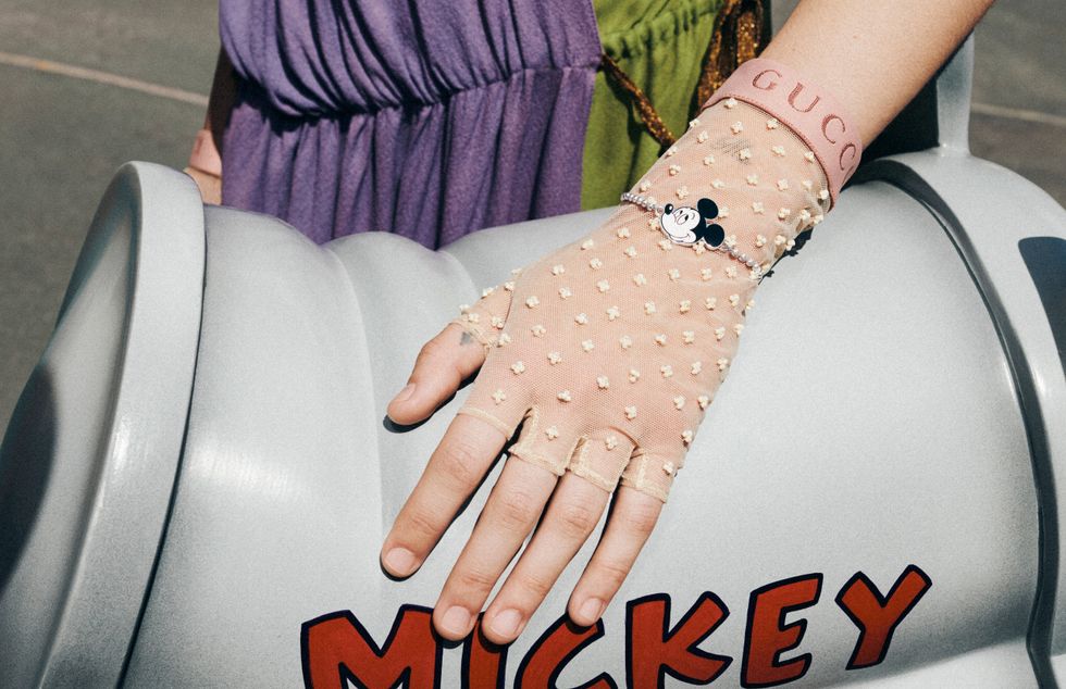 Mickey Mouse motifs feature prominently on everything from shoes and bags to small leather goods. A new material — the beige/black Mini GG Supreme canvas with Mickey Mouse print is seen on handbags, luggage and shoes for men and women. Colourful prints, jacquard motifs and embroidered patches with Mickey Mouse complete the collection.