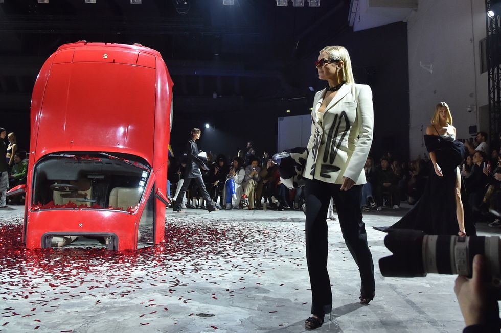 The set featured various automobiles sewn in half, with tons of confetti covering them at the show's finale. According to Abloh, they had to switch venues because "a bunch of dresses couldn't fit thru the doorway of the first venue." He also changed the name of the show to "Slightly Off" at the last minute. (He originally planned to call it "Spin Cycle.")