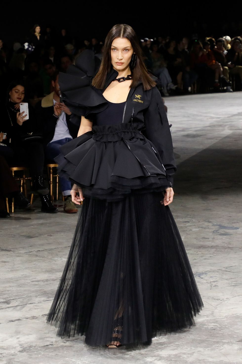 The momager surprised everyone when she took her lap in a white tailored blazer, black trousers and sky-high heels. Her supermodel daughters appeared shortly after, with Gigi in a large trapeze-shaped pleated dress and Bella in an all-black ruffled tulle number. (Both looks were designed in collaboration with outdoor label Arc'teryx.)