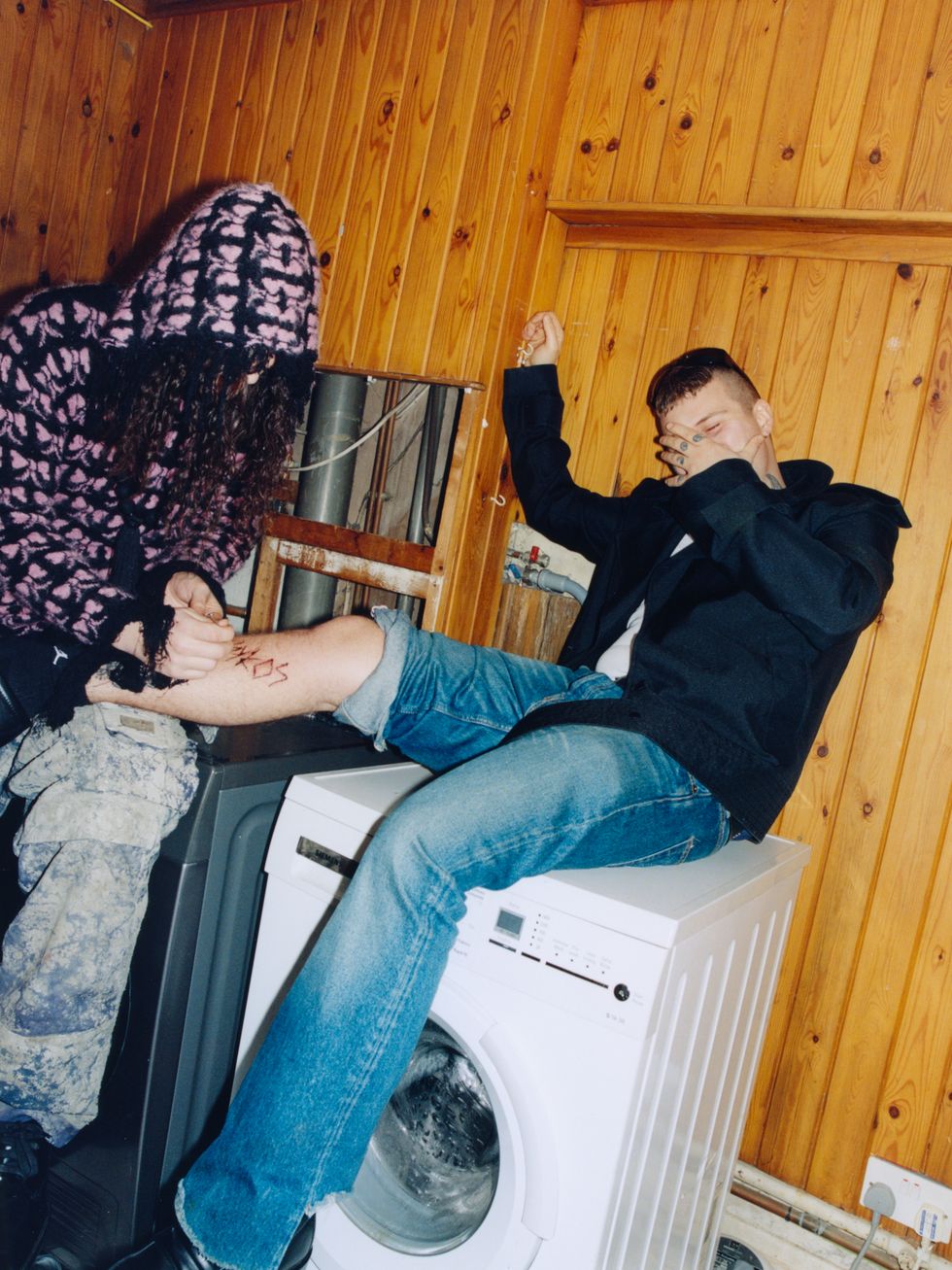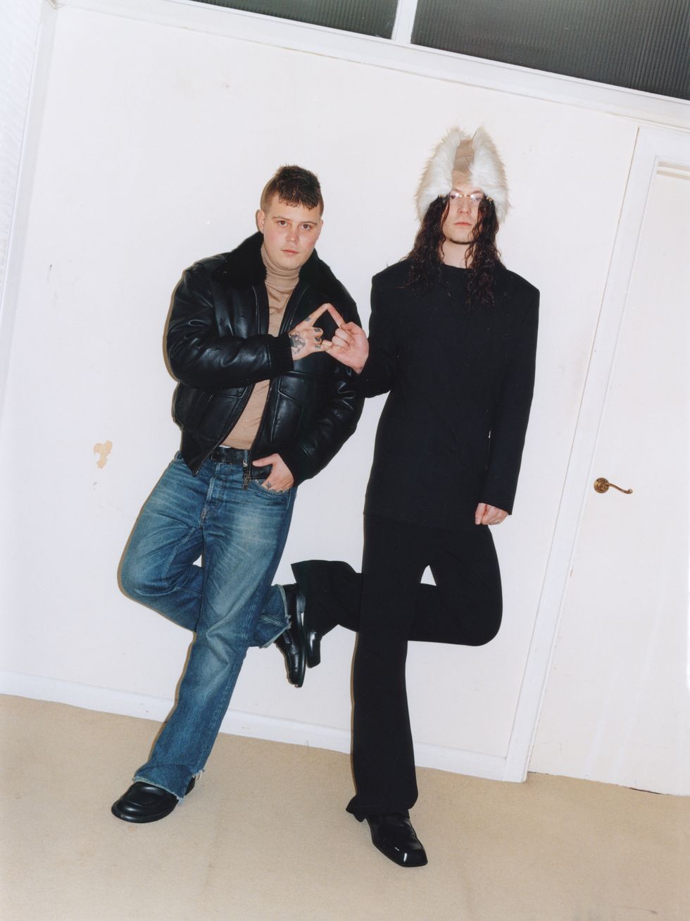 (On Yung Lean) Jacket: Celine, Shoes: Louis Vuitton, Pants and belt: Talent's own (On Bladee) Hat: Hurtence, Shoes: Prada, Top, pants and necklace: Stylist's own