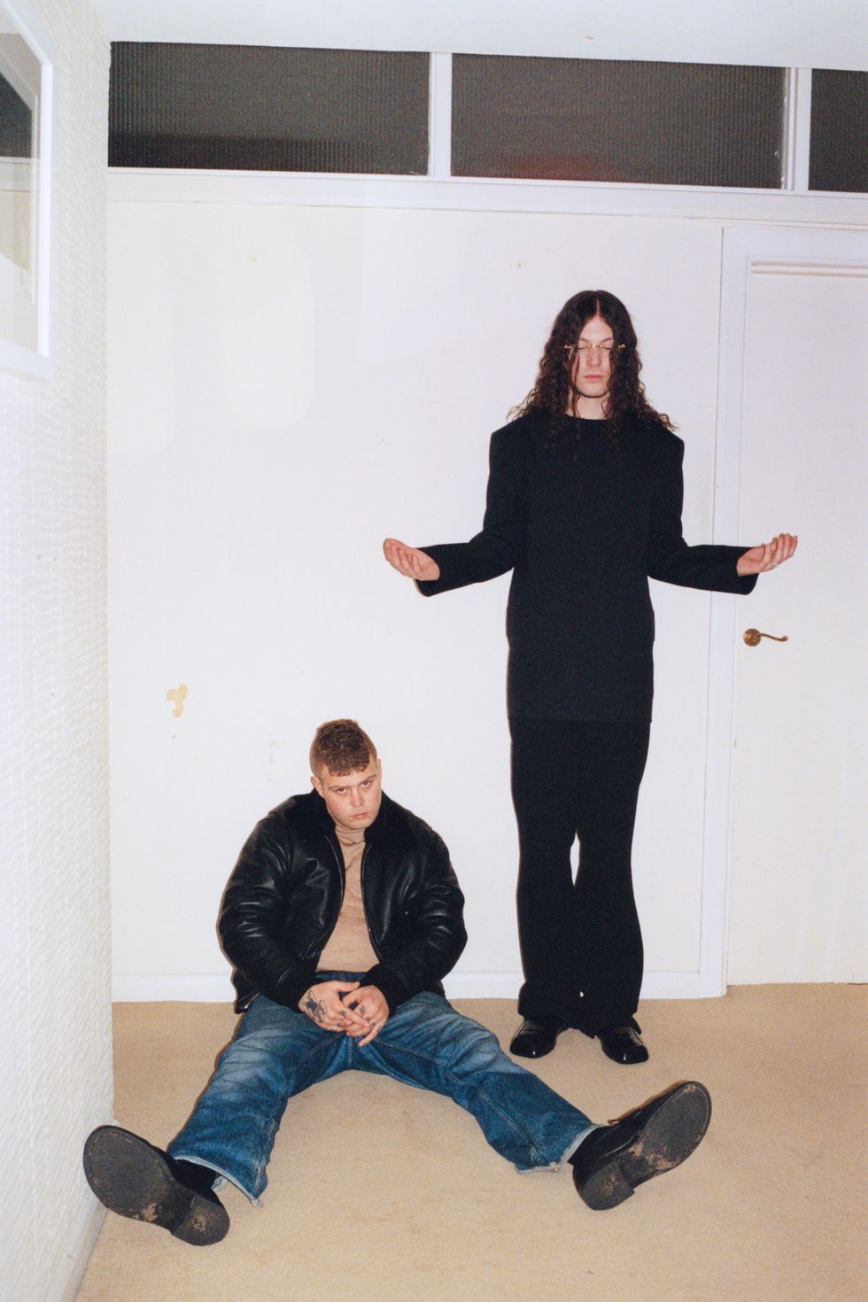 (On Yung Lean) Jacket: Giorgio Armani, Shoes: Louis Vuitton, Pants and belt: Talent's own (On Bladee) Pants: Jean Paul Gaultier, Hoodie and shoes: Talent's own,