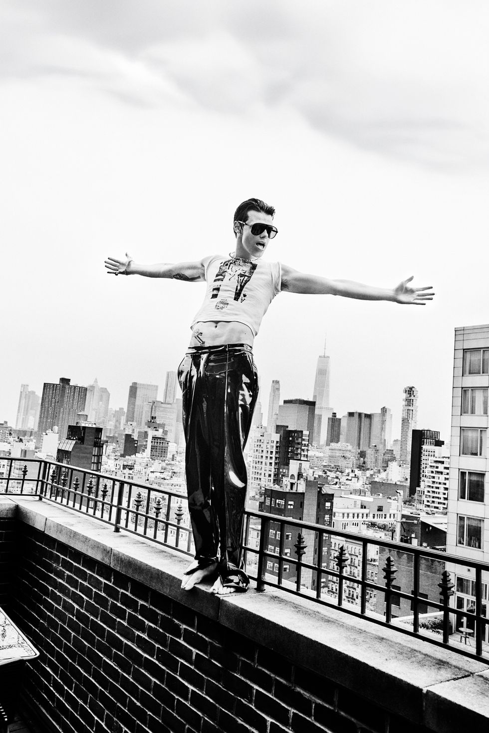 Glasses: Tom Ford, Pants: Landeros, T-shirt: The Cast, Jewelry: Chrome Hearts