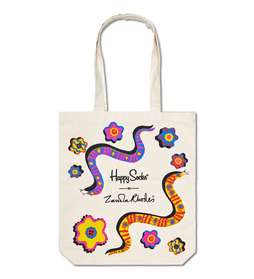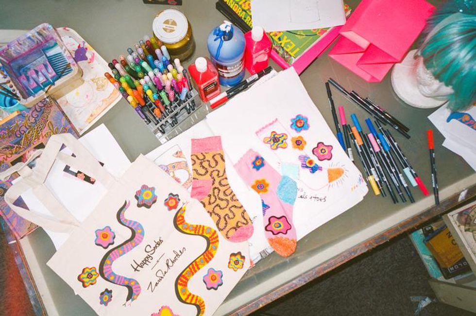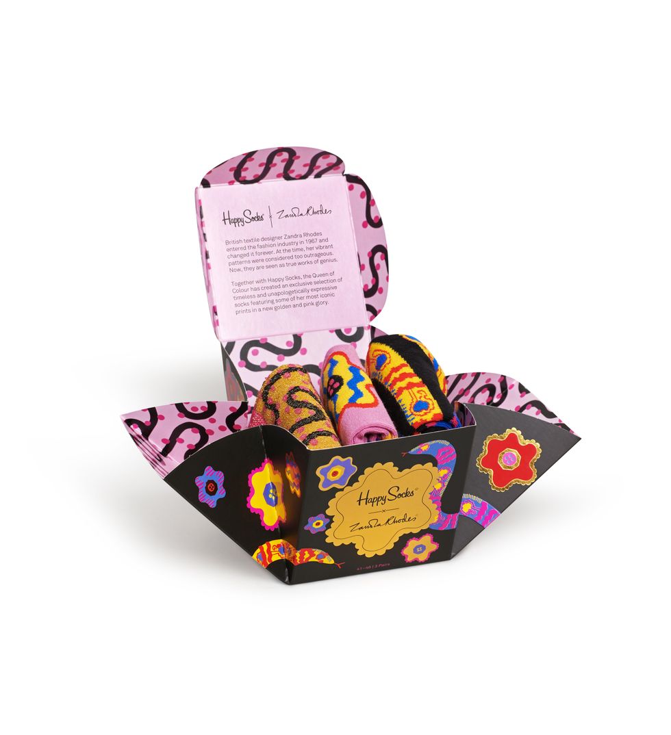 Having dressed everyone from Freddie Mercury to Princess Diana and Jackie Kennedy, Rhodes recently celebrated 50 years in fashion with a retrospective at London's Textile Museum. Her rainbow penthouse, which resides above the museum, is where she met with the team at Happy Socks, who enlisted her to create a collection featuring her signature prints and patterns.