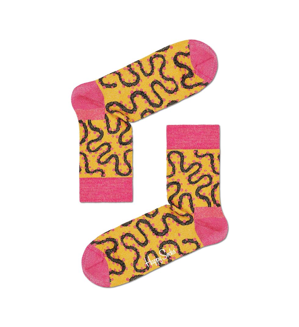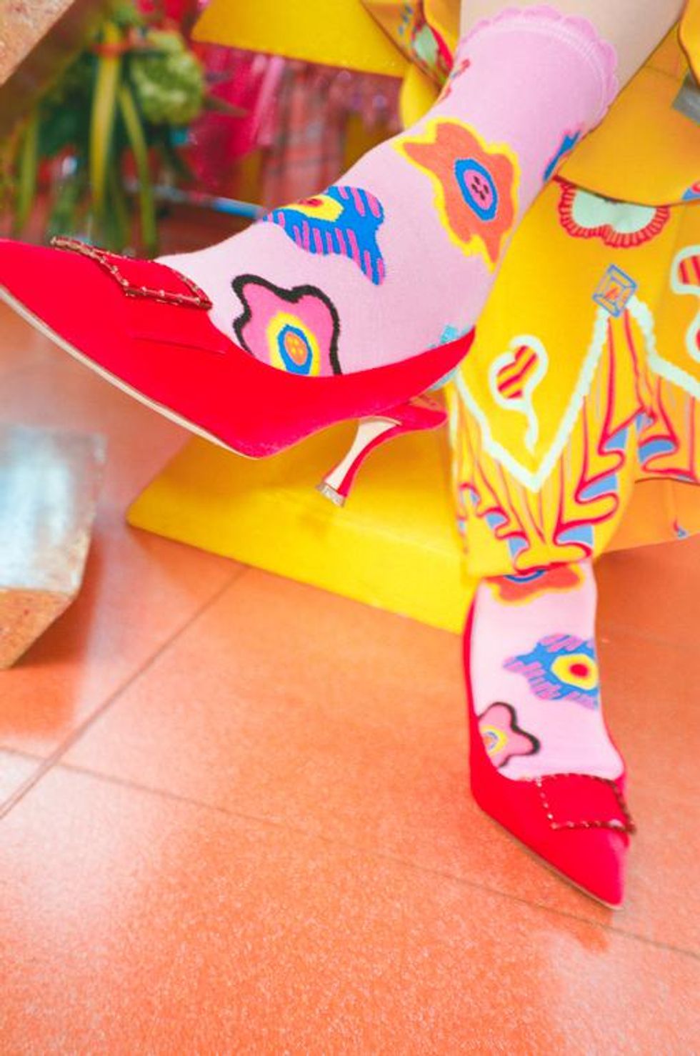 I designed a set of socks that would go into a magical folding box so it would make you feel fabulous when you undo this. We worked out how you can make the little snakes that I originally designed for tattoos that you could stick on your arms in the '60s that could become a sort of blue and yellow print that goes around your legs. Then my classic wiggles that I've been doing for years and putting onto all sorts of things and here they are all glittery with little pink dots and things. That's really fabulous. And then my magical buttons now, which are flowers, held in the center with buttons and then flowery heels and toes.