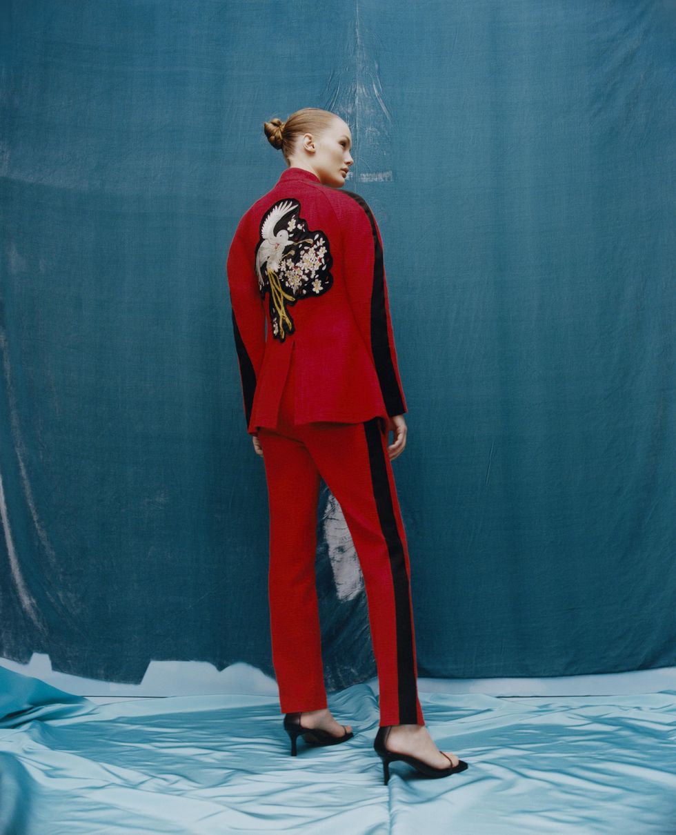 Abdul Abasi and Greg Rosborough — the creative directors behind Abasi Rosborough — crafted a statement-making red suit with black stripes down the sleeves and a large, ornamental bird motif embellished onto the back. The duo enlisted naturally grown cotton for the garment, proving that sustainable, alternative fabrics do not diminish the vibrancy of a piece.