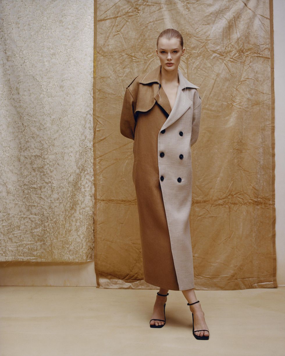 Mexican designer Victor Barragán designed a dual-tone, oversized trench with a double-breasted construction out of naturally grown linen, sourced from crops free of artificial irrigation and genetic modification. New York-based Private Policy used the same textile to create a three-piece, light pink suit decorated with subtle-yet-elegant fruit embroidery.