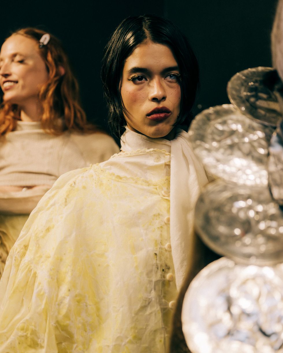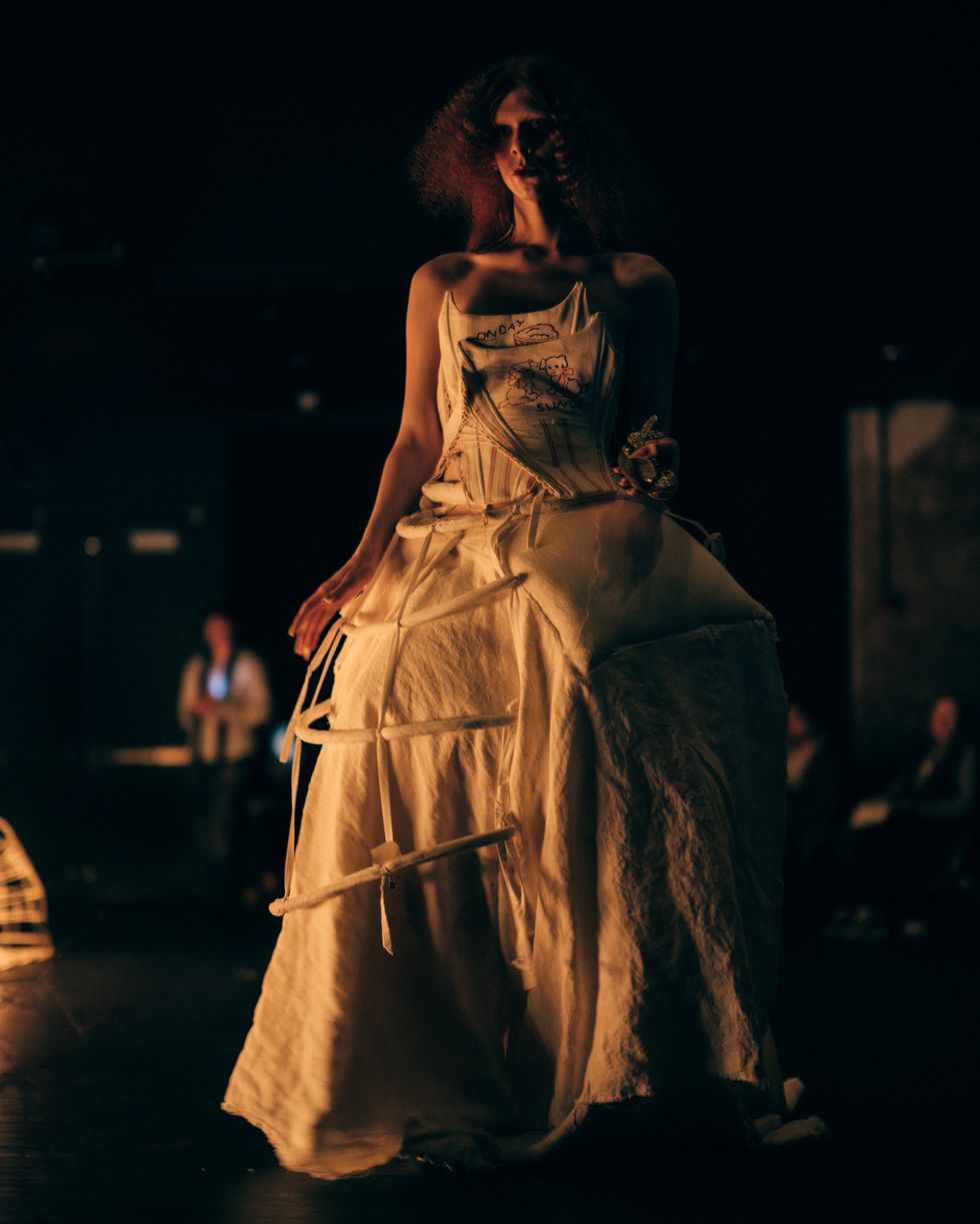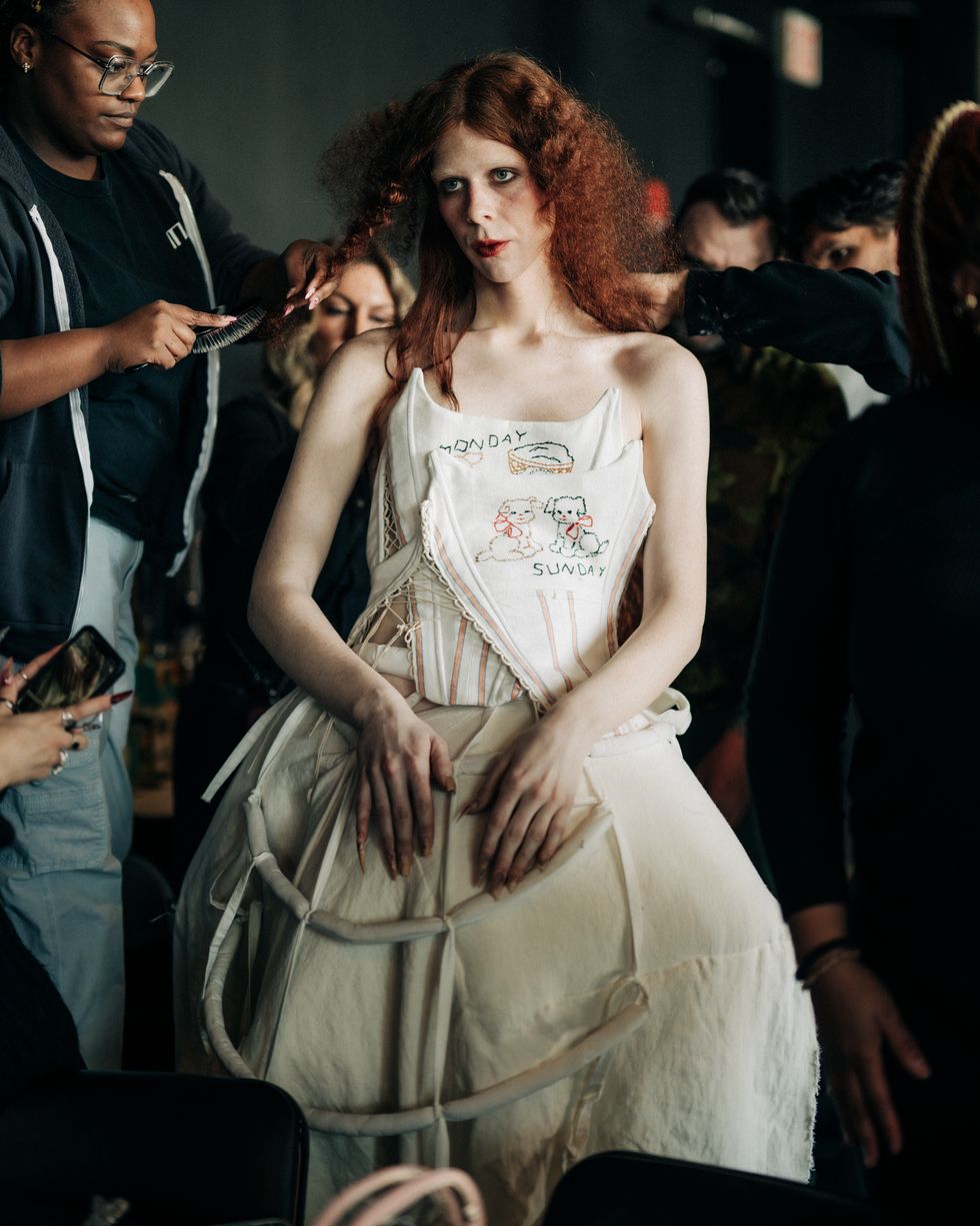 As guests filed in, previous collection model Lulu Yao Gioiello sat perched on the floor in front of the stage. Dressed in a highly structural dress within a hallmark silhouette of the brand (laced-up, radically round, creamily oat), she said, “We’re friends. I was in her first show, and I’ve used her pieces and photo shoots for a book series I publish.”