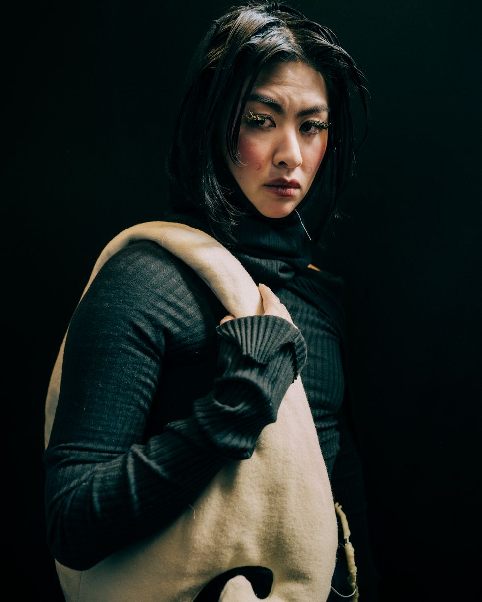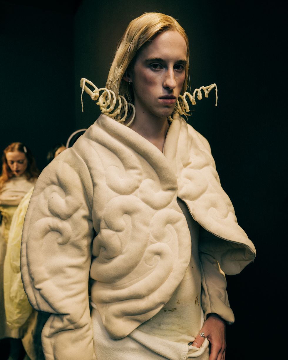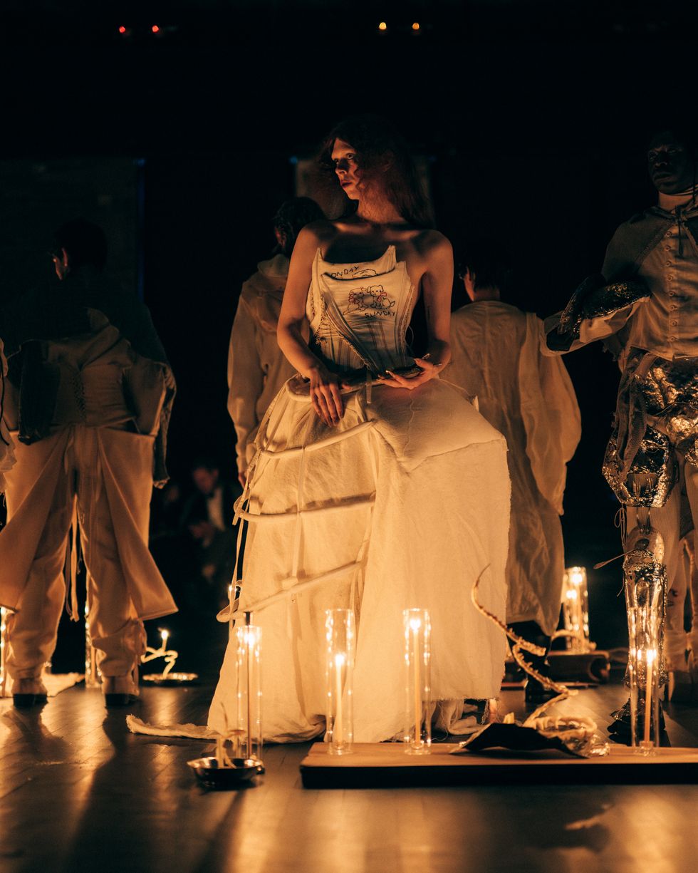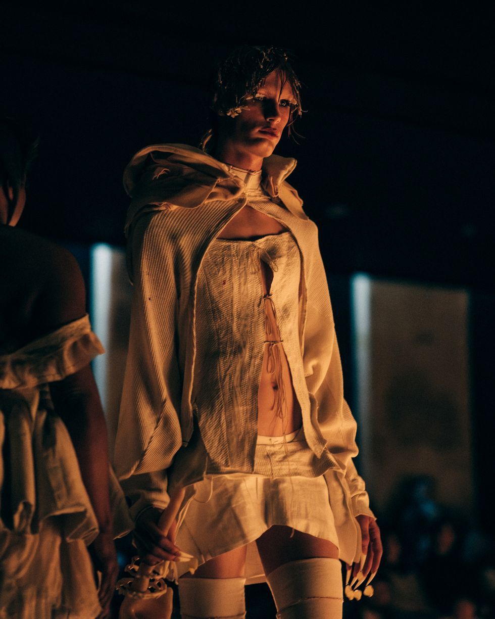 As guests filed in, previous collection model Lulu Yao Gioiello sat perched on the floor in front of the stage. Dressed in a highly structural dress within a hallmark silhouette of the brand (laced-up, radically round, creamily oat), she said, “We’re friends. I was in her first show, and I’ve used her pieces and photo shoots for a book series I publish.”