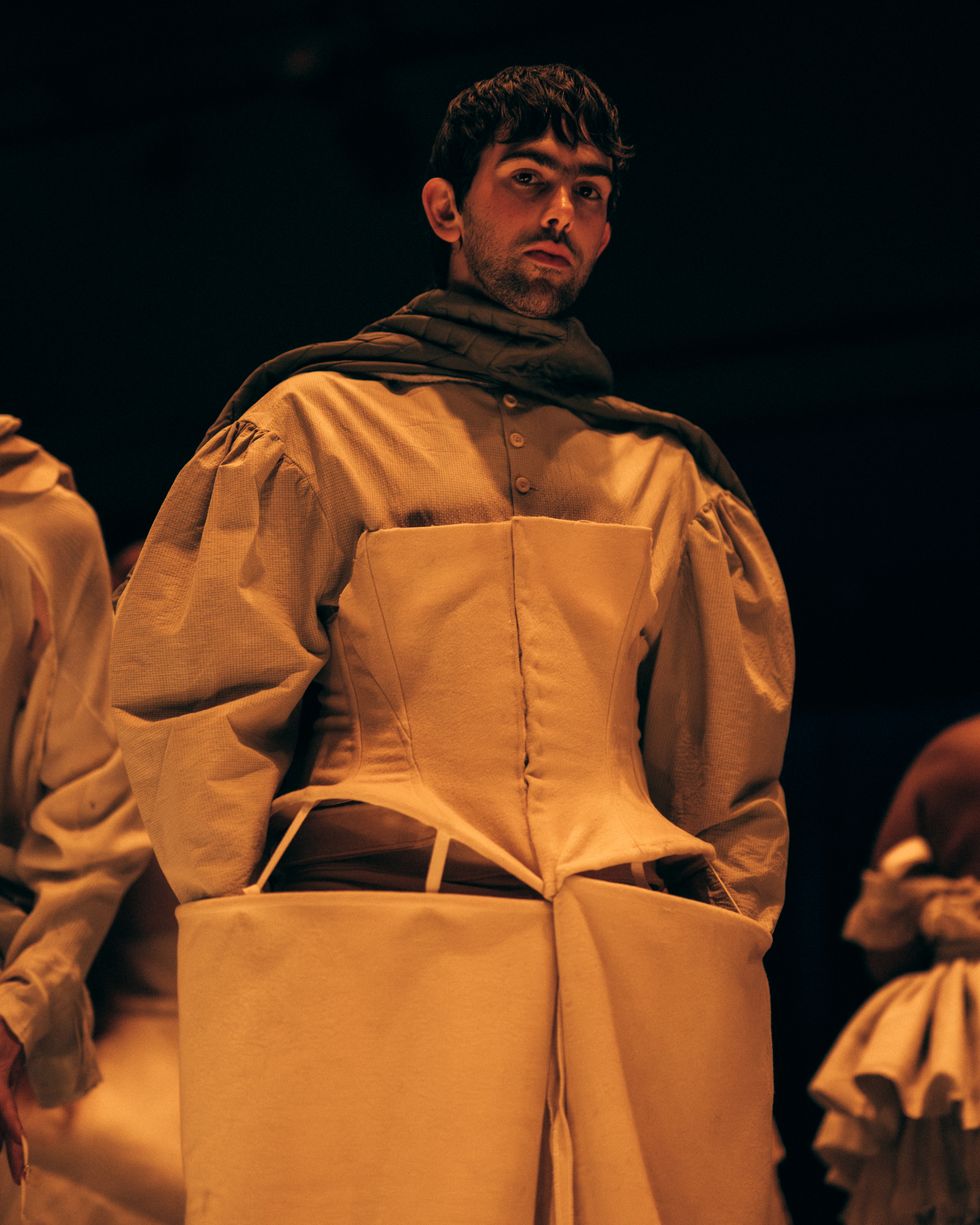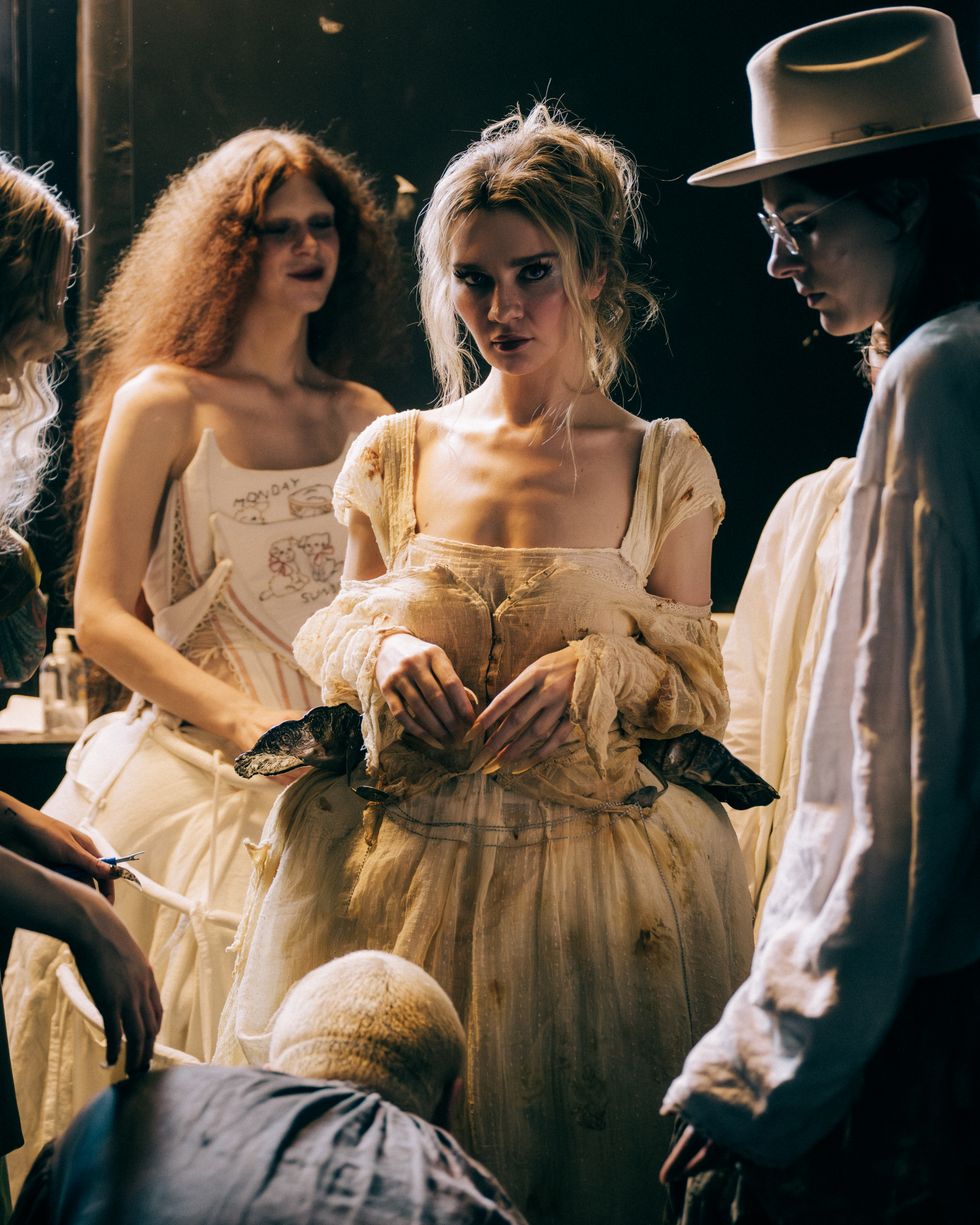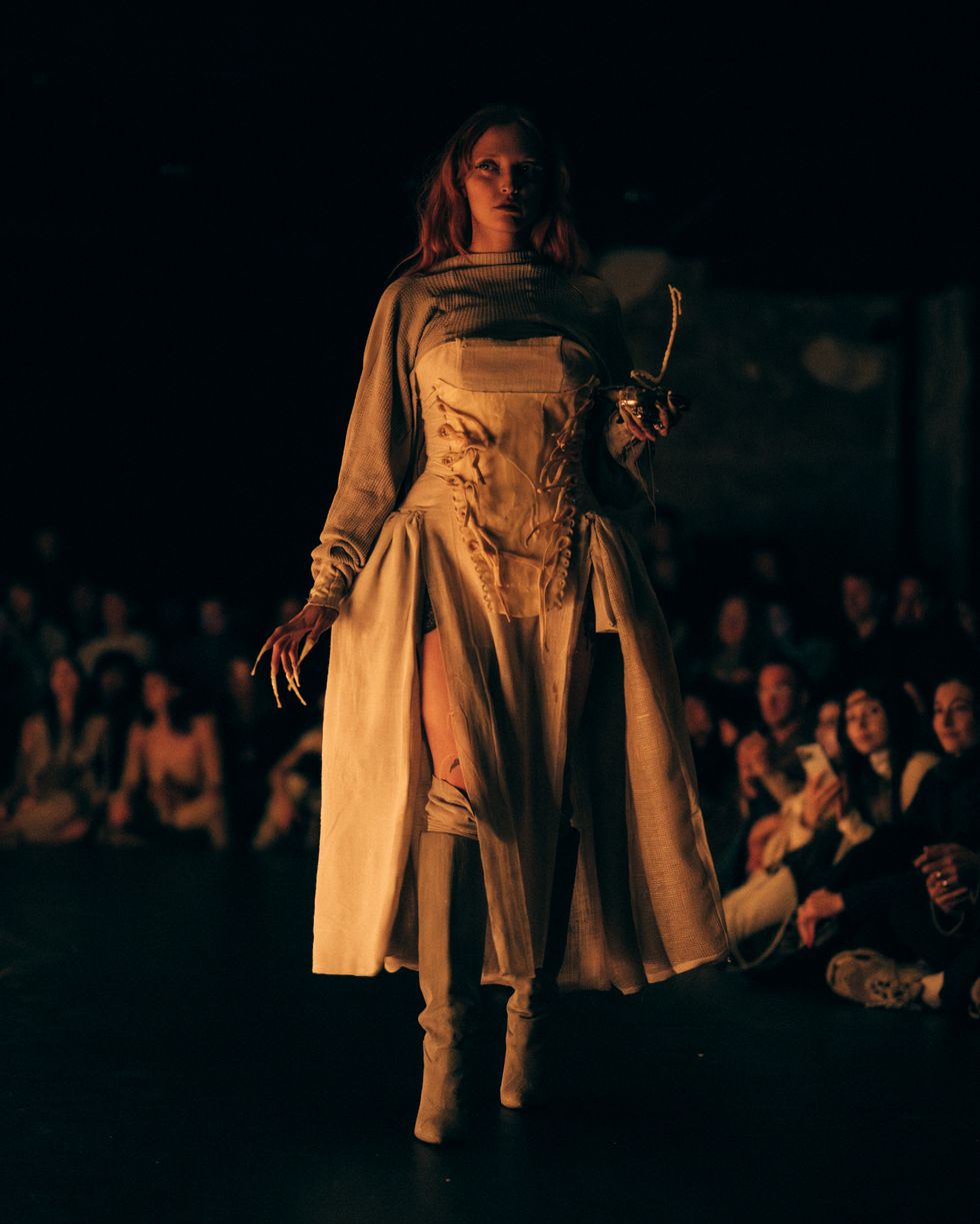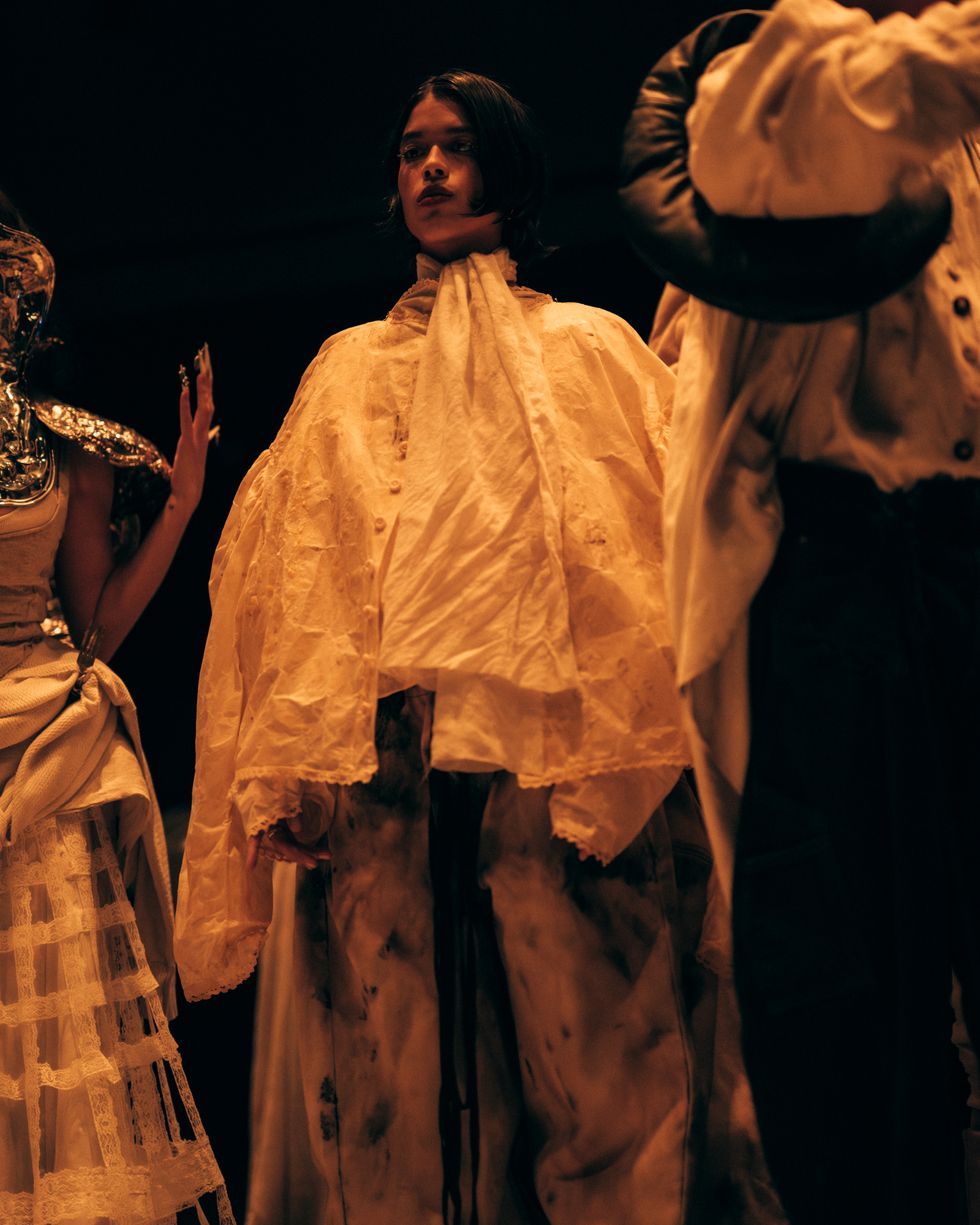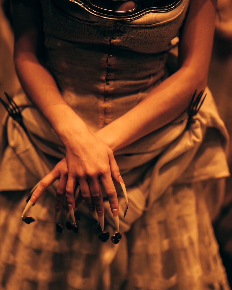 Long, flowing tresses grazed the backs of characters in a gray gown and a wildly geometric crinoline skirt, respectively. Spindly nail beds and hair texture were sourced from bee and candle wax, and unisex corsetry dominated torsos above shoes that were grounded in wood blocks, skinny stiletto daggers and tied with strips of fabric or hidden from sight altogether by tumbling lengths of naturally-dyed fabrics.