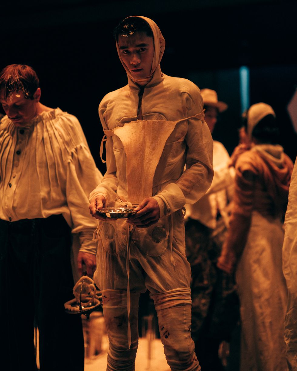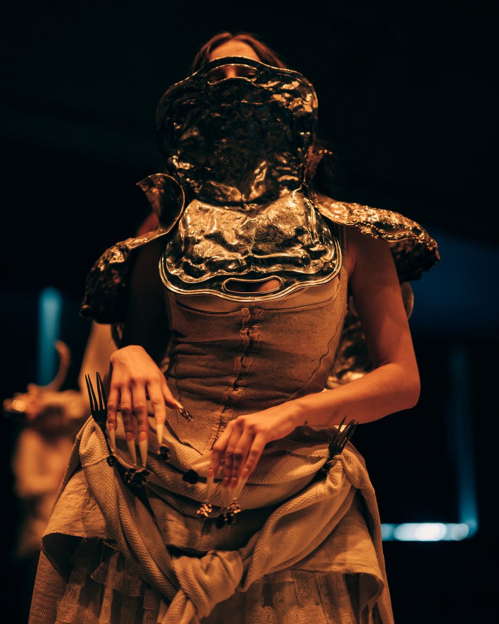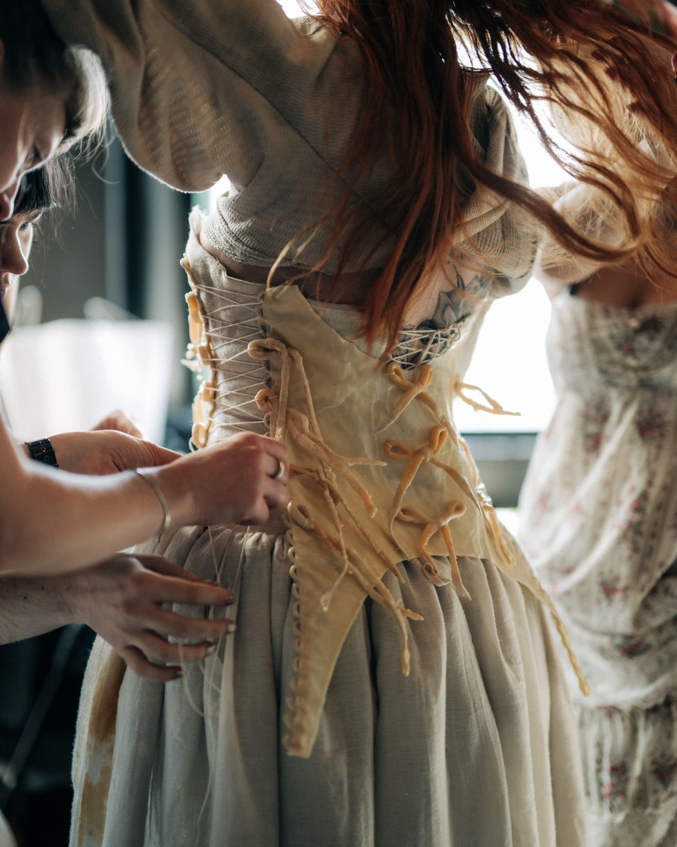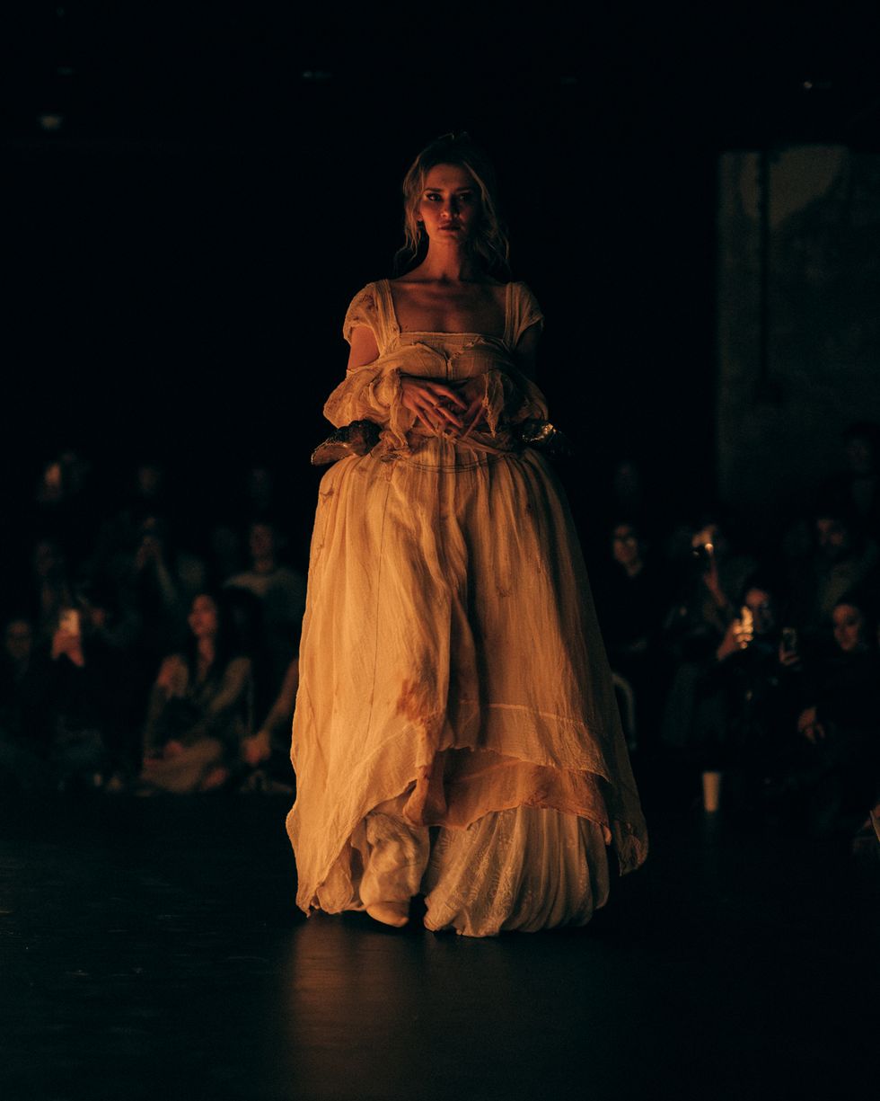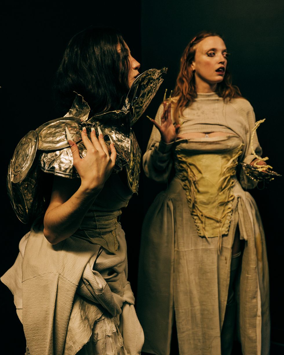 Long, flowing tresses grazed the backs of characters in a gray gown and a wildly geometric crinoline skirt, respectively. Spindly nail beds and hair texture were sourced from bee and candle wax, and unisex corsetry dominated torsos above shoes that were grounded in wood blocks, skinny stiletto daggers and tied with strips of fabric or hidden from sight altogether by tumbling lengths of naturally-dyed fabrics.