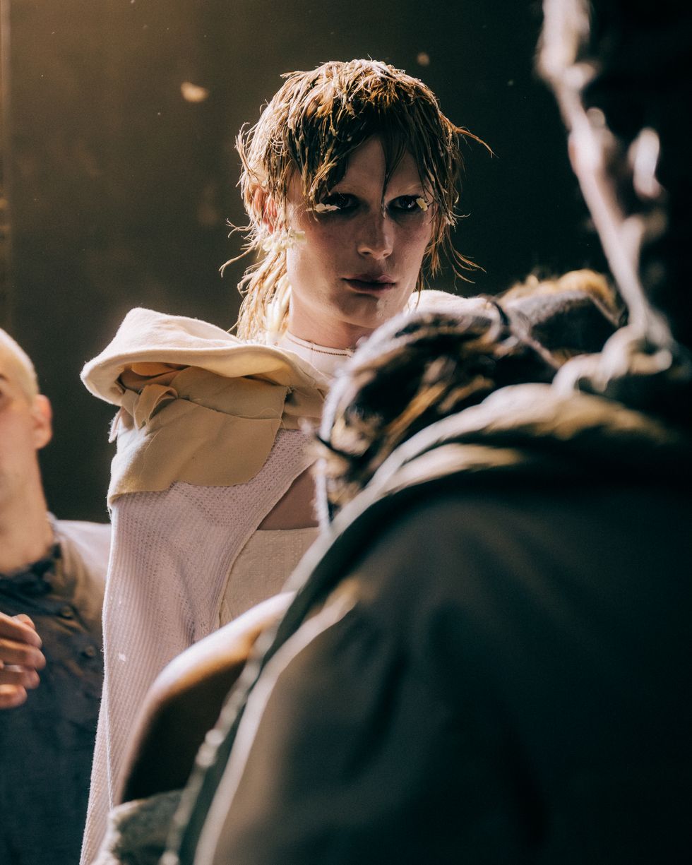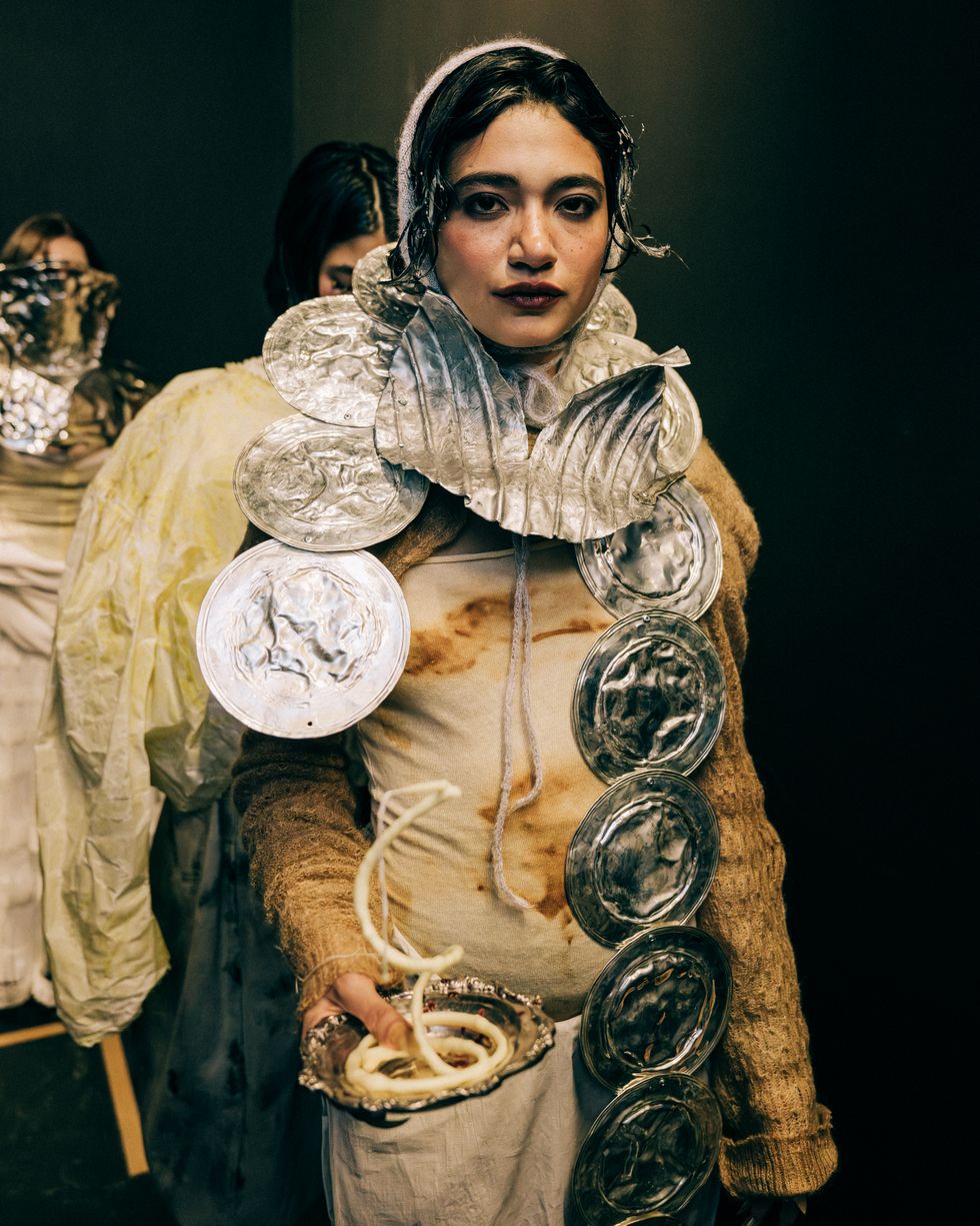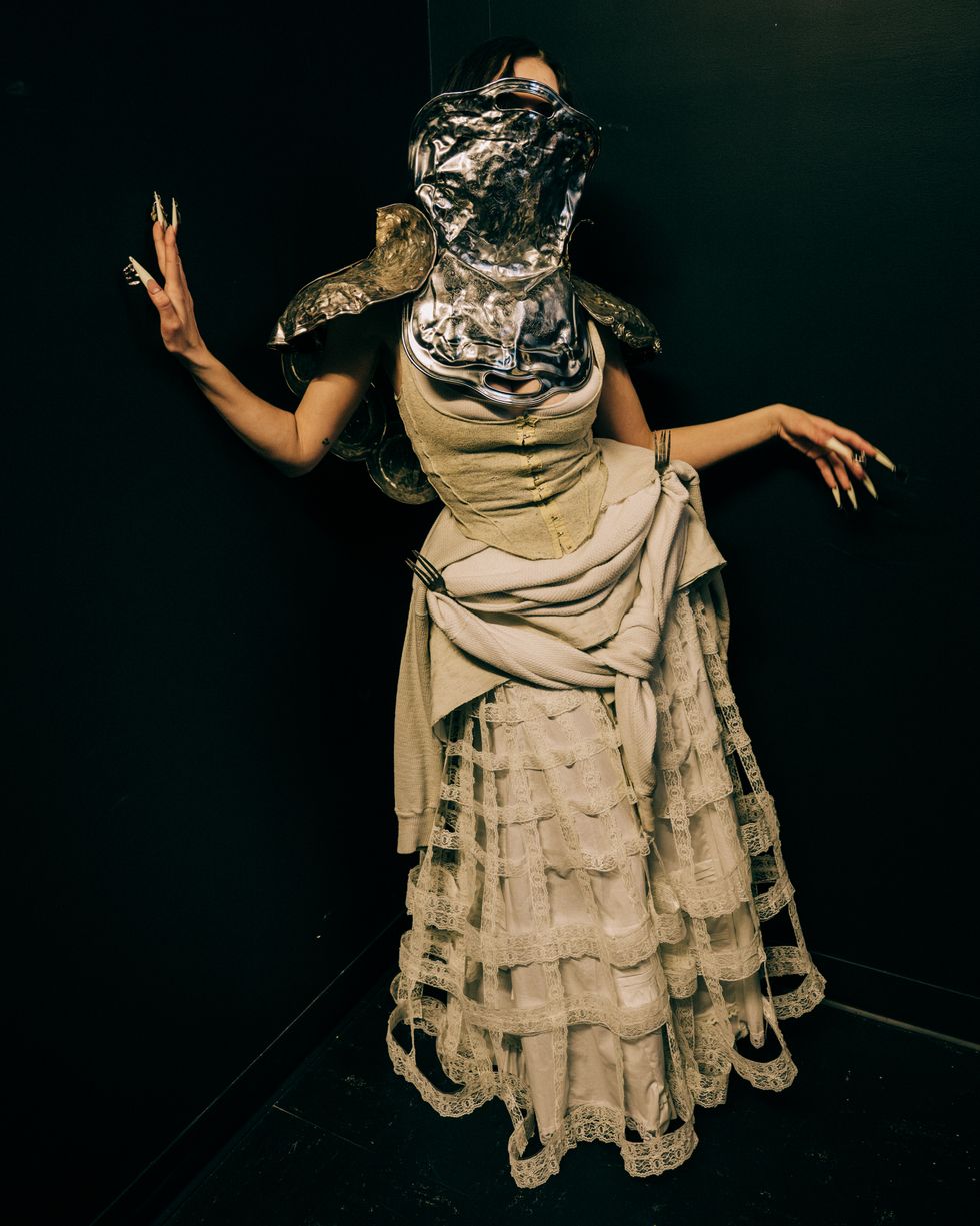 Looks this season were neolithic, primal, Victorian or radically contemporary, depending on where one looked. Silver plates produced in collaboration with artist Vasaris Balzekas rested across the chest of one model, the rest of their look made up of white bloomers and a flowing nightgown. “The show brings together a sense of darkness, foreboding and heaviness, but then communing in space together to think about how we can lead and uplift one another,” Whalen explained to PAPER backstage.