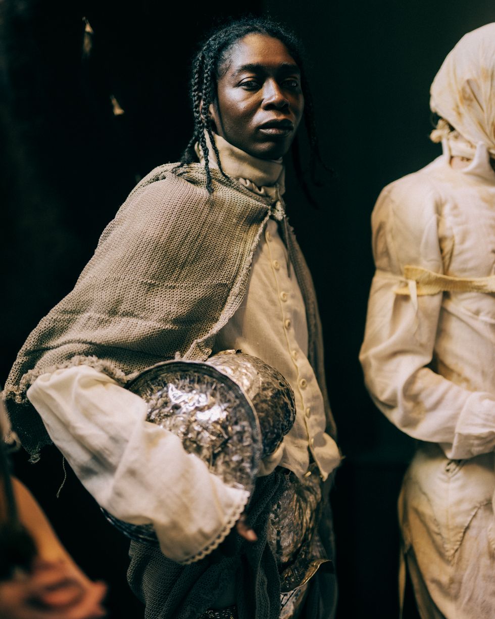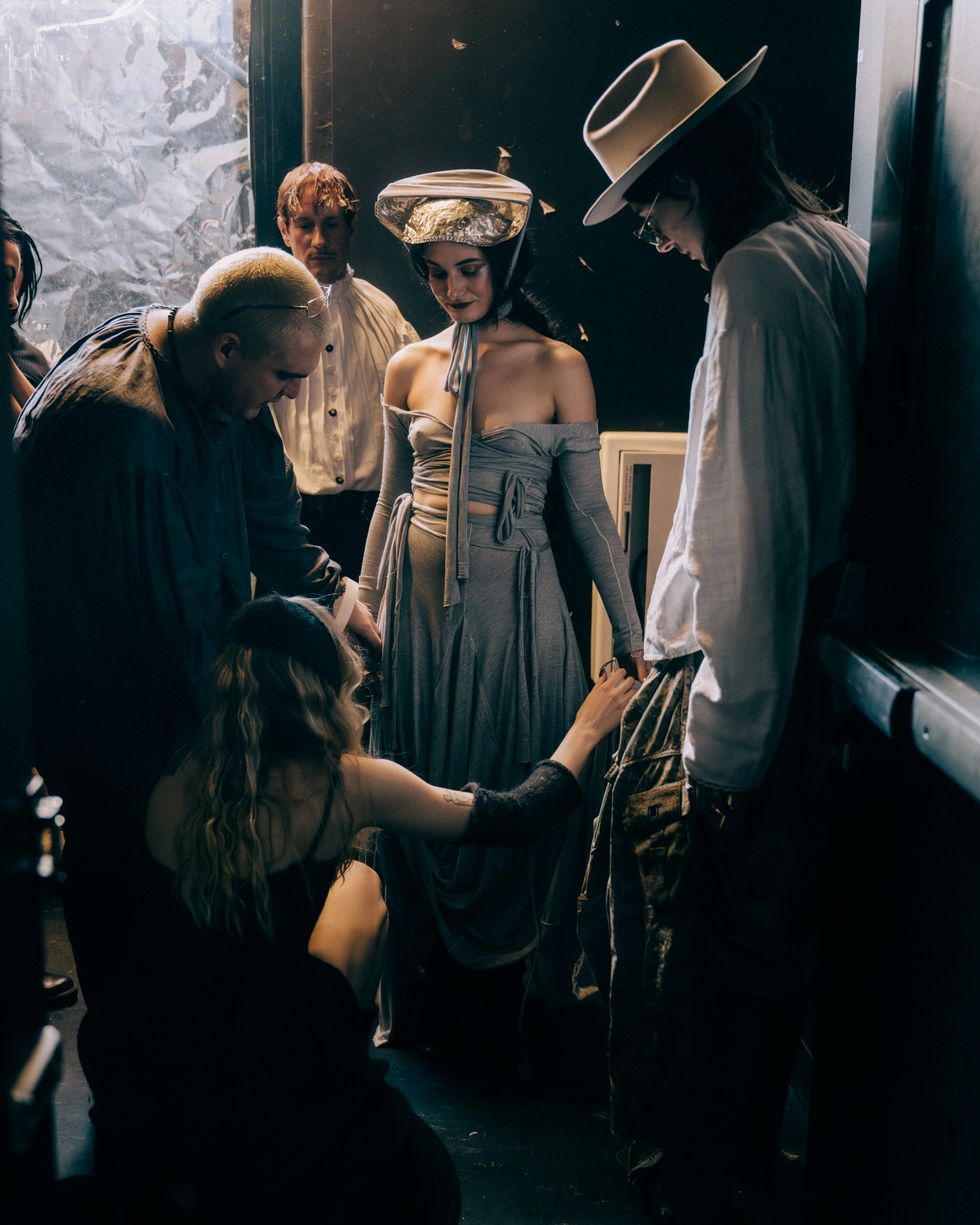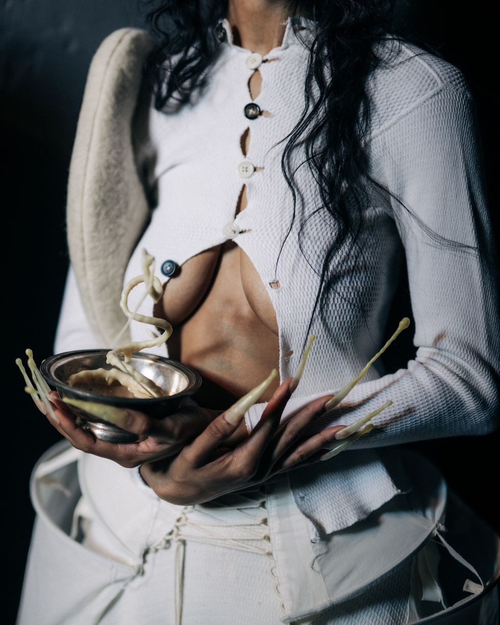 Looks this season were neolithic, primal, Victorian or radically contemporary, depending on where one looked. Silver plates produced in collaboration with artist Vasaris Balzekas rested across the chest of one model, the rest of their look made up of white bloomers and a flowing nightgown. “The show brings together a sense of darkness, foreboding and heaviness, but then communing in space together to think about how we can lead and uplift one another,” Whalen explained to PAPER backstage.