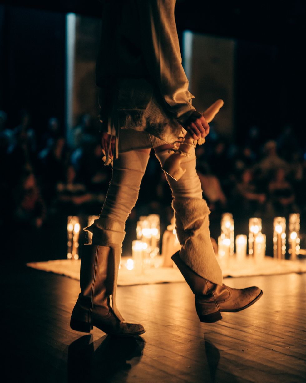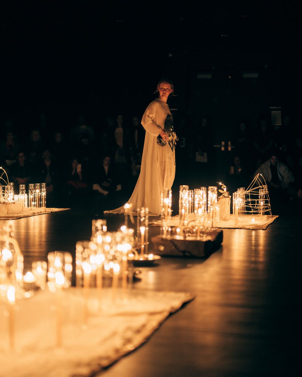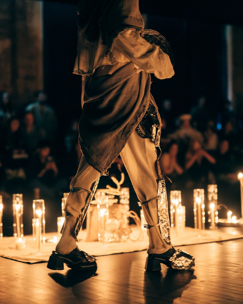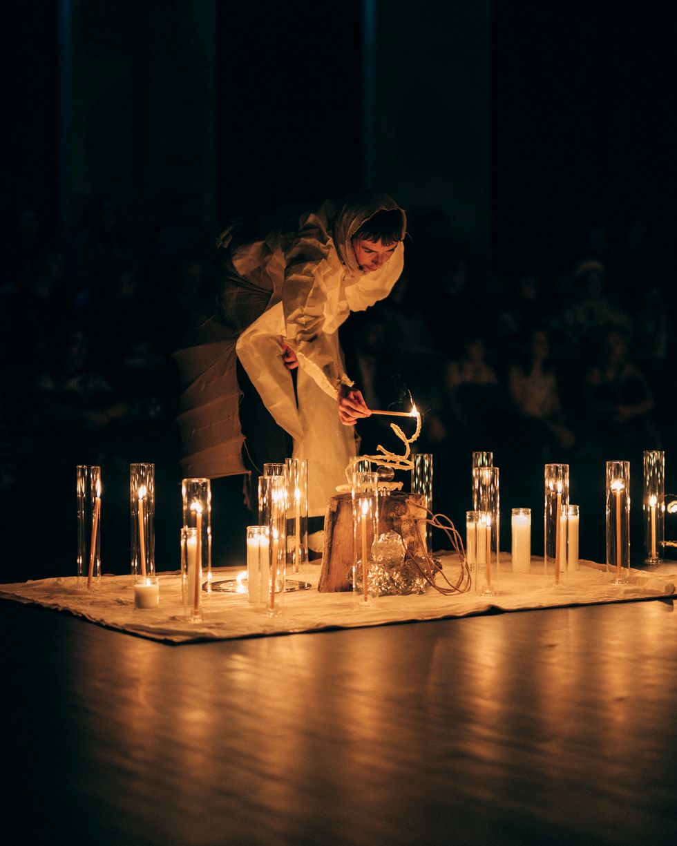 In the vaunted auditorium of Performance Space, an array of six large mats featured candles, glassware and natural ephemera across the floor; they served as a complex, witchy concentration of altar-esque proportions. “The candles are a physical way of sharing life and bring people closer into your space. There’s also something counterintuitive about doing a fashion show in candlelight — it forces people to be present in a new way,” Whalen shared.