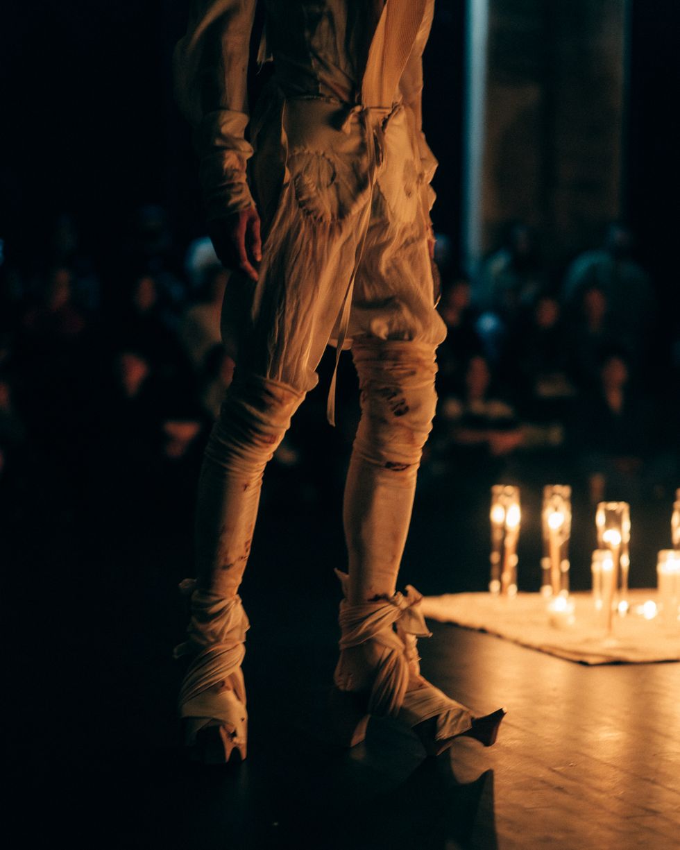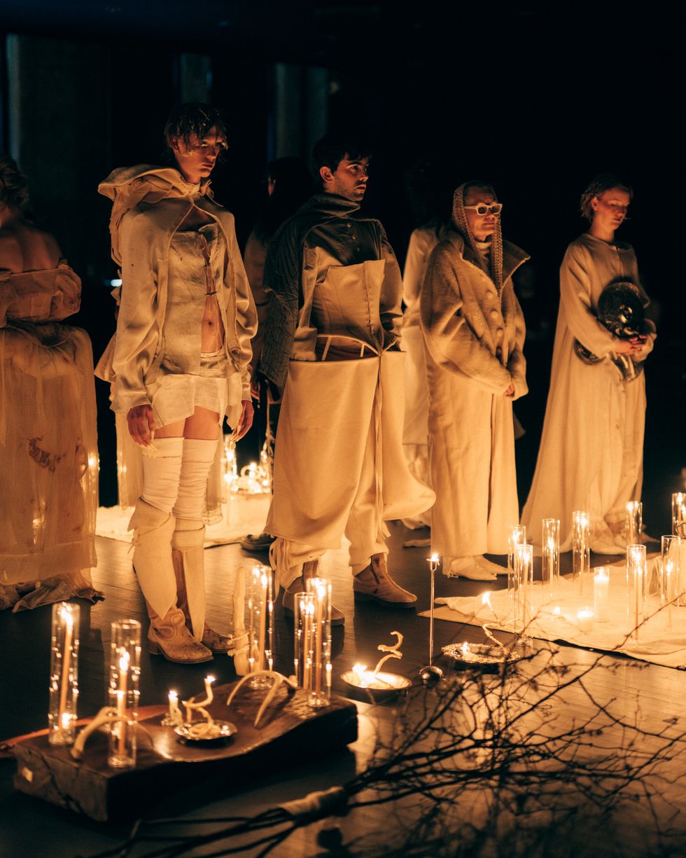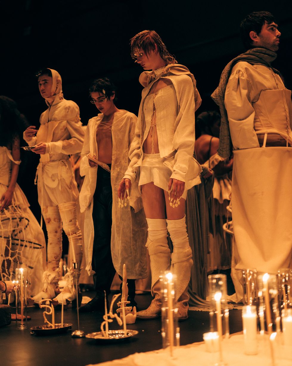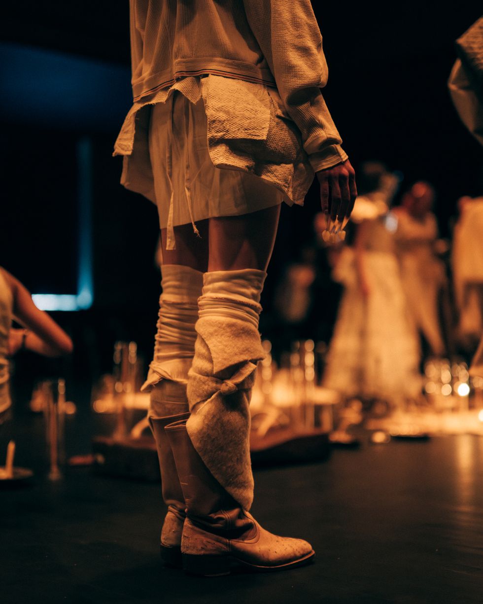 In the vaunted auditorium of Performance Space, an array of six large mats featured candles, glassware and natural ephemera across the floor; they served as a complex, witchy concentration of altar-esque proportions. “The candles are a physical way of sharing life and bring people closer into your space. There’s also something counterintuitive about doing a fashion show in candlelight — it forces people to be present in a new way,” Whalen shared.
