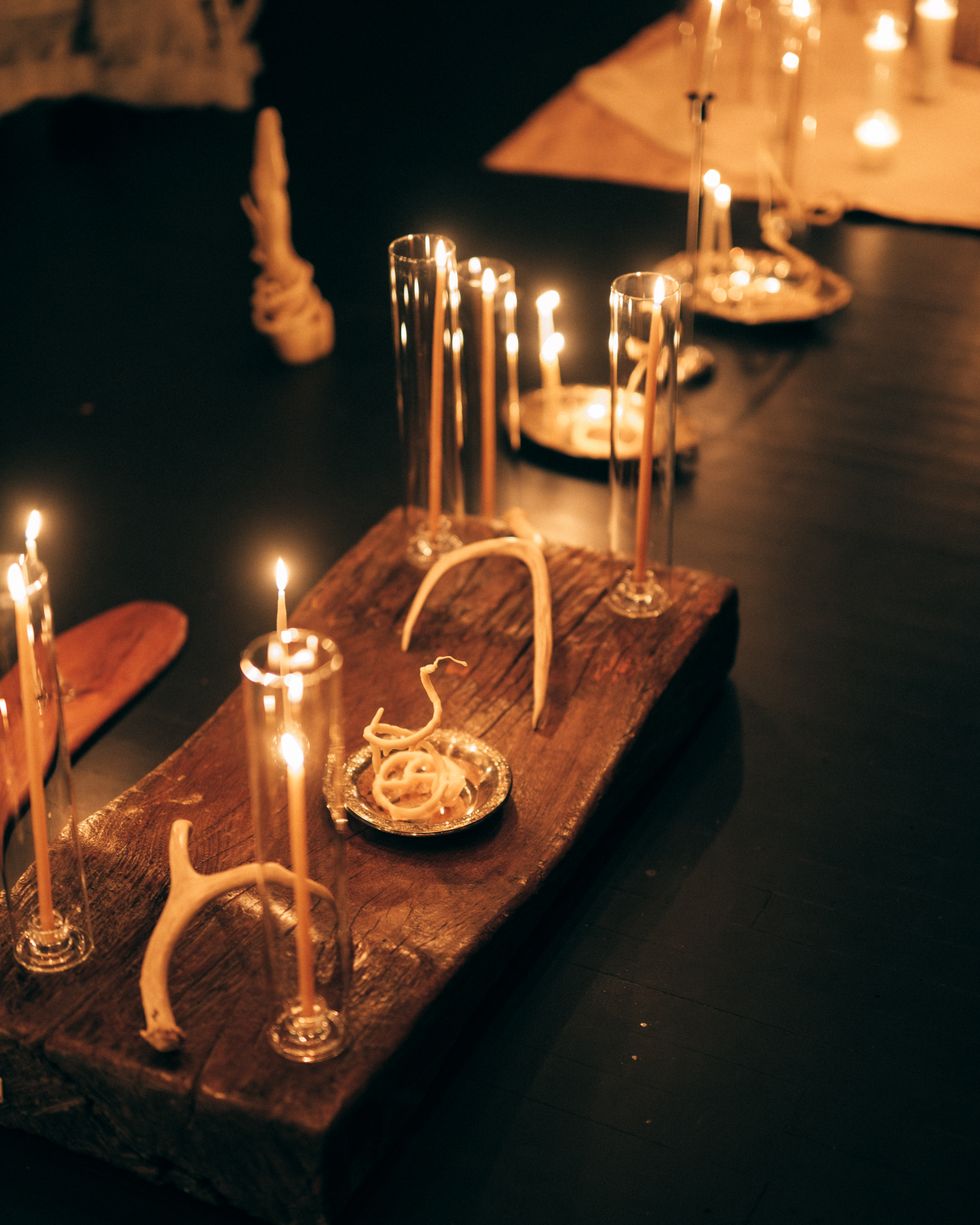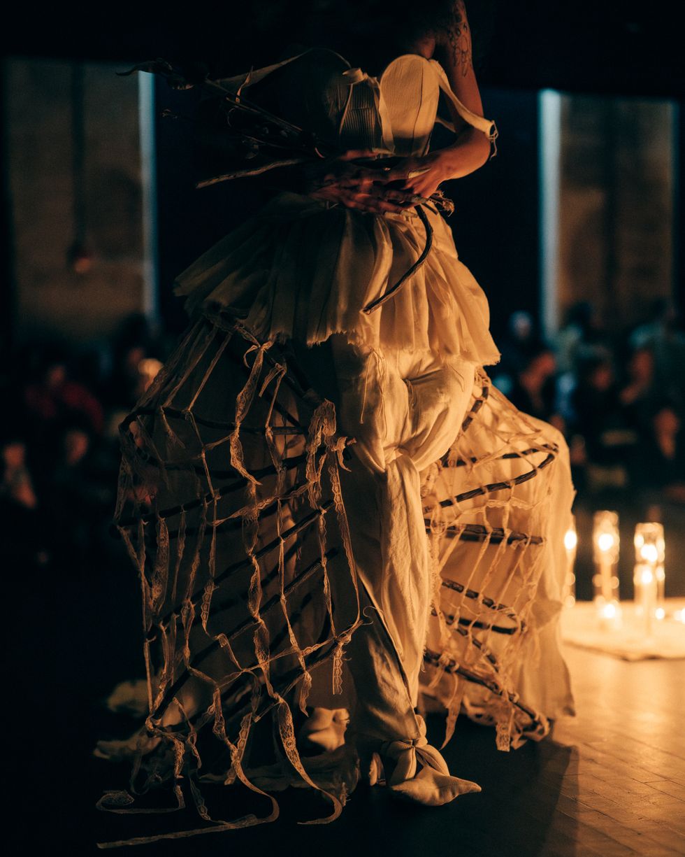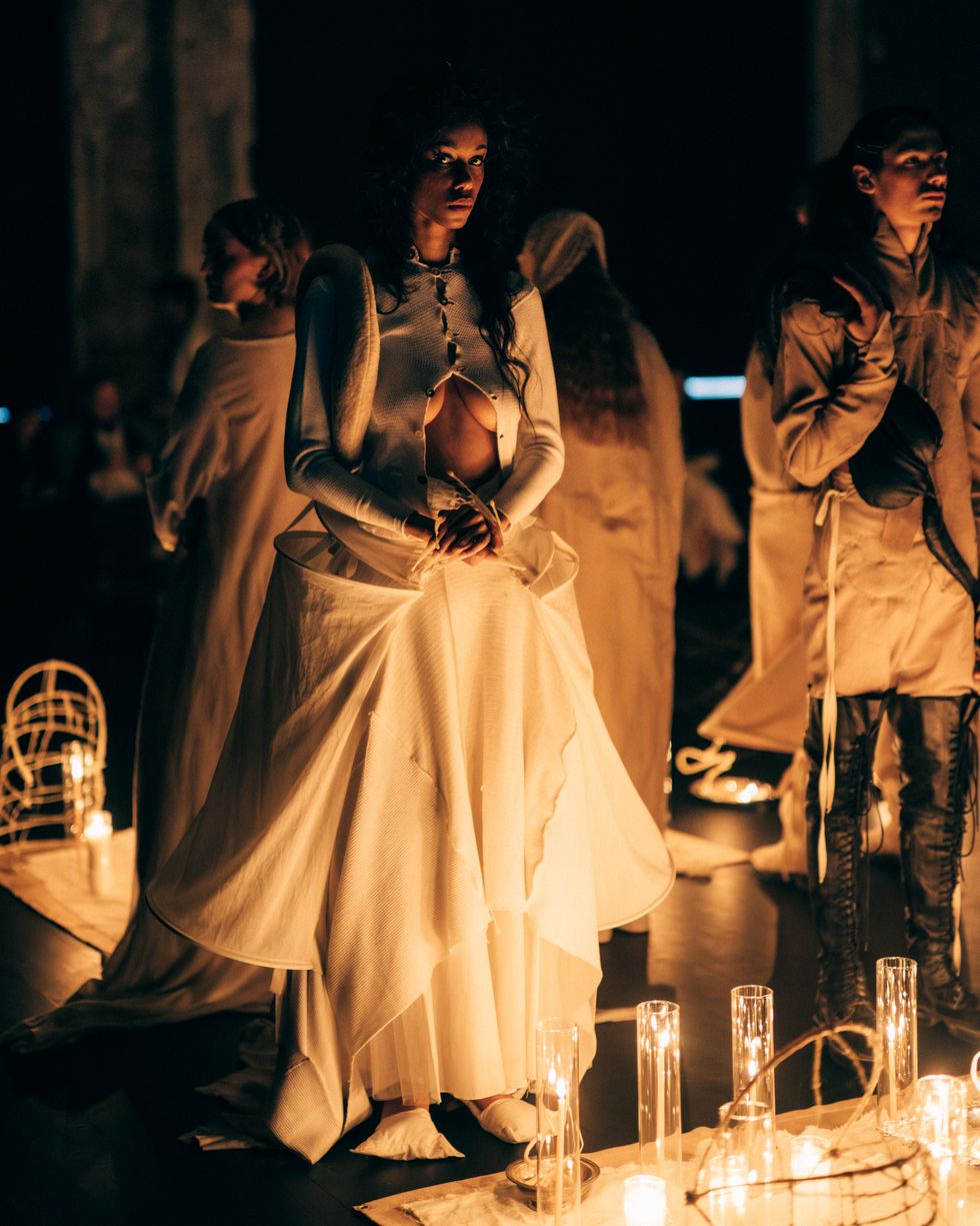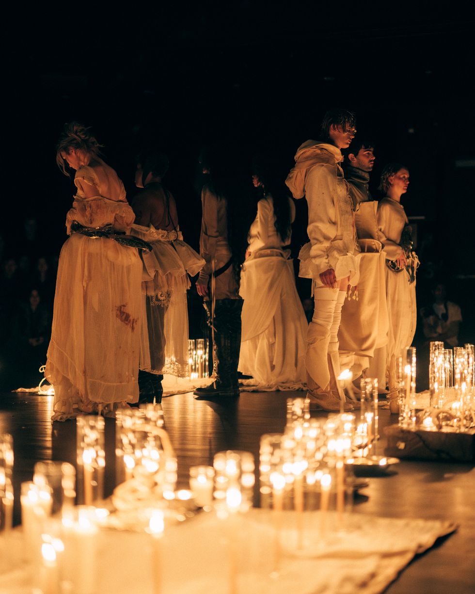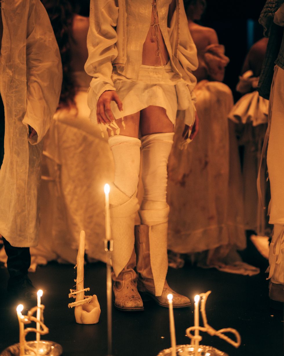 In the vaunted auditorium of Performance Space, an array of six large mats featured candles, glassware and natural ephemera across the floor; they served as a complex, witchy concentration of altar-esque proportions. “The candles are a physical way of sharing life and bring people closer into your space. There’s also something counterintuitive about doing a fashion show in candlelight — it forces people to be present in a new way,” Whalen shared.