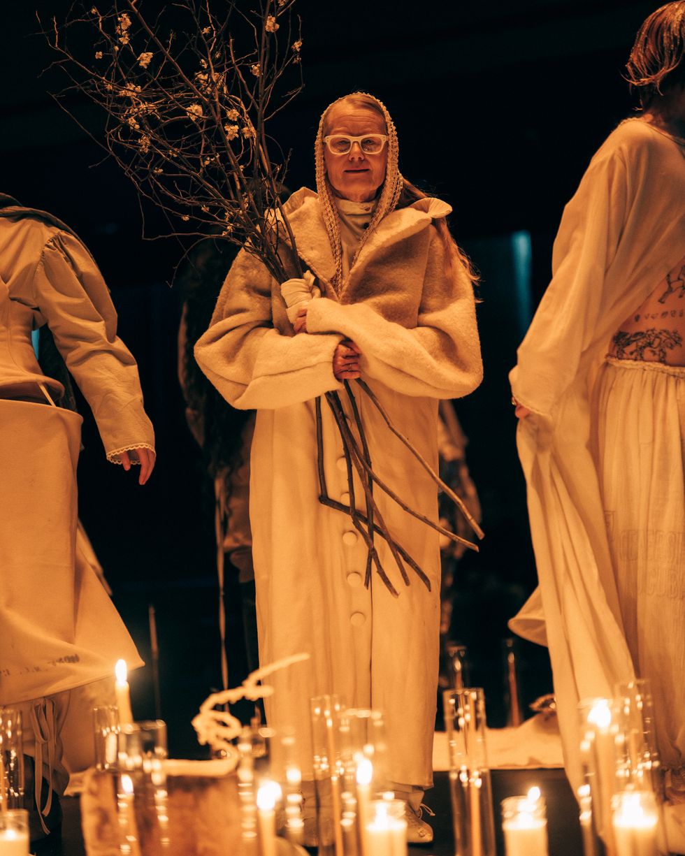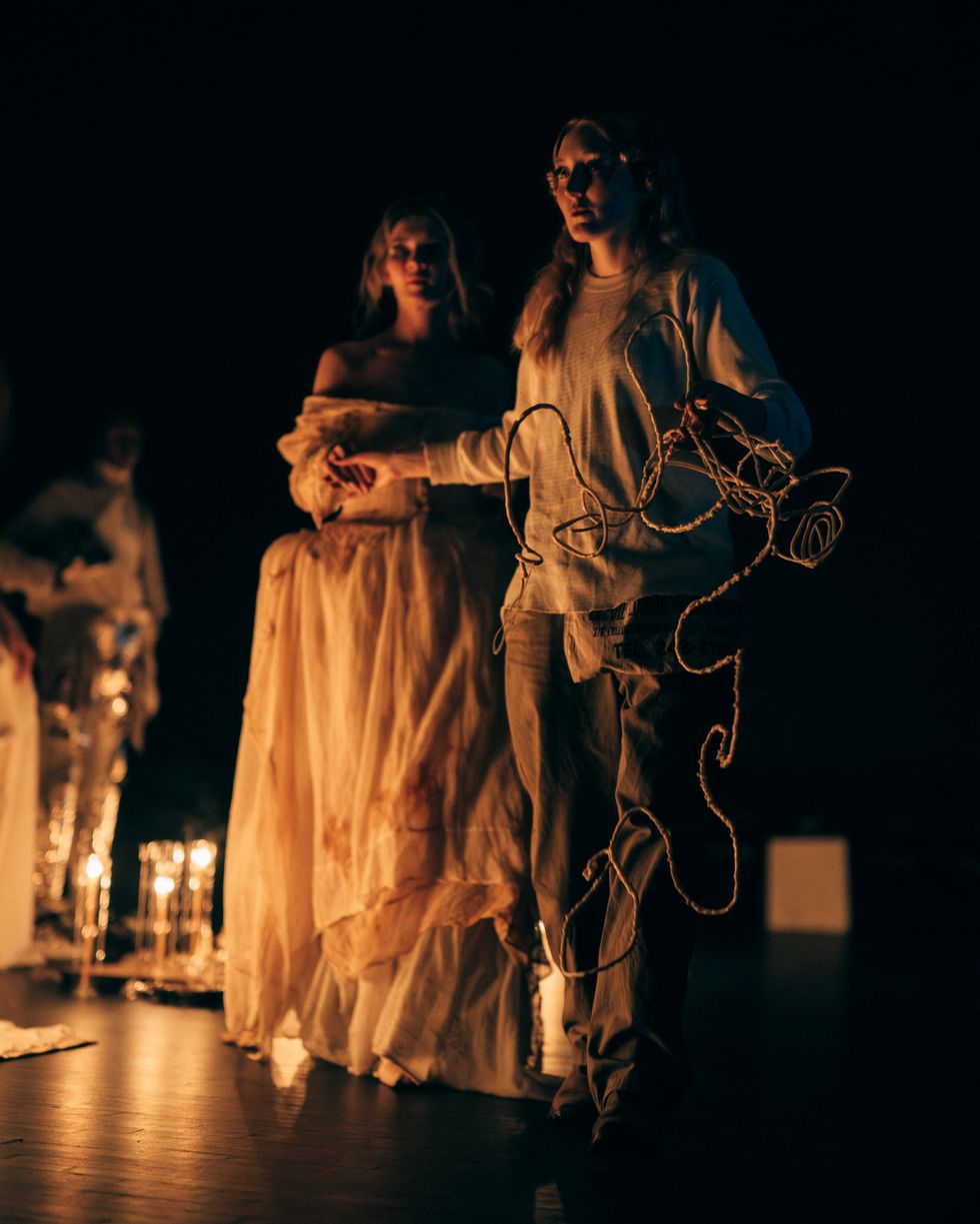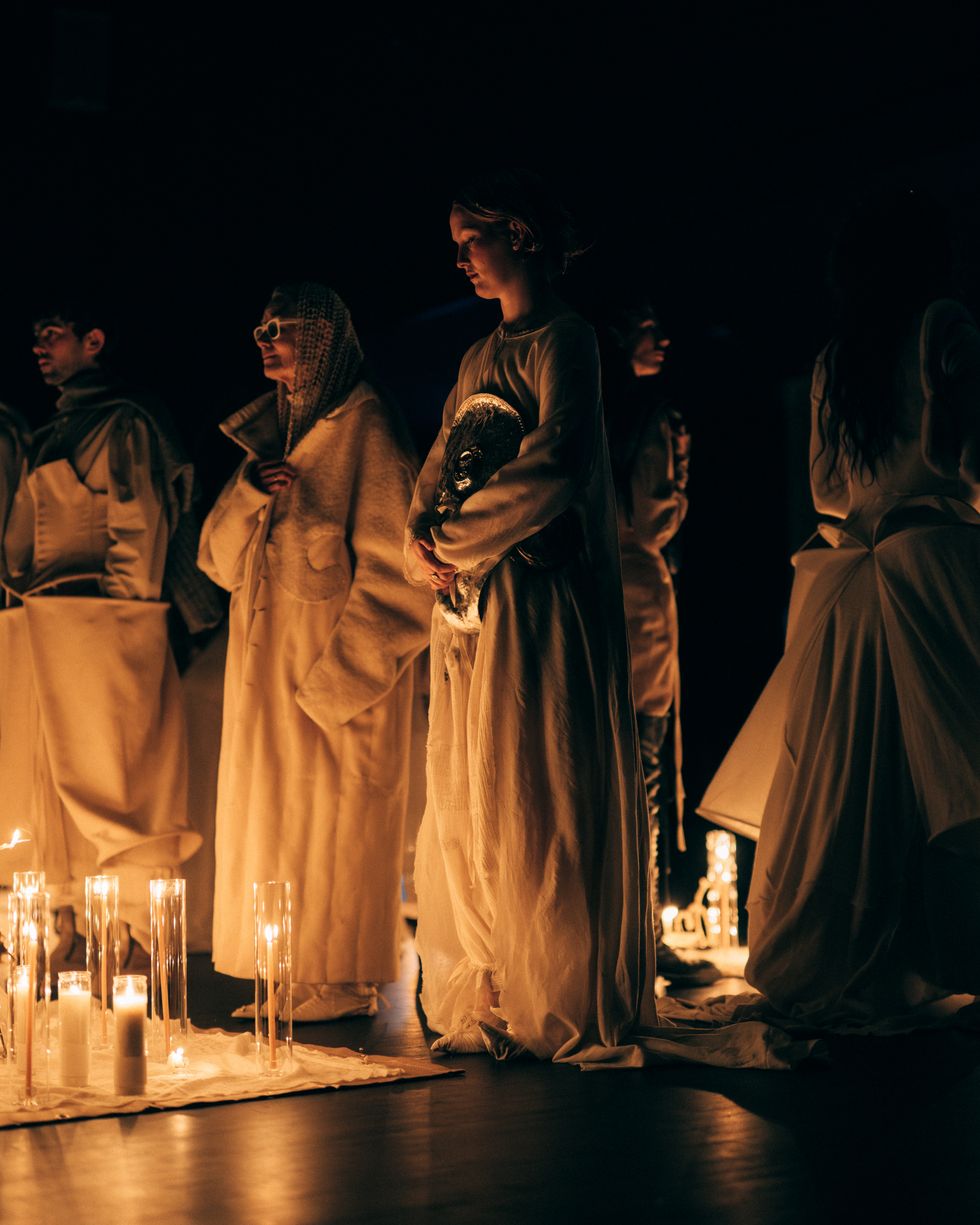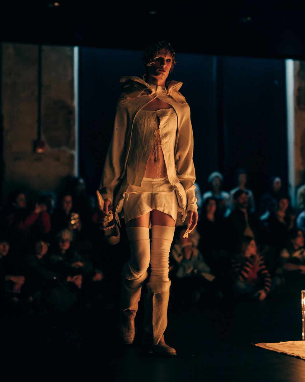 In the vaunted auditorium of Performance Space, an array of six large mats featured candles, glassware and natural ephemera across the floor; they served as a complex, witchy concentration of altar-esque proportions. “The candles are a physical way of sharing life and bring people closer into your space. There’s also something counterintuitive about doing a fashion show in candlelight — it forces people to be present in a new way,” Whalen shared.